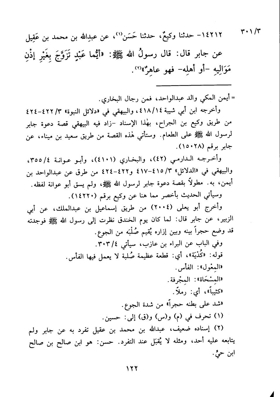 (٢) إسناده ضعيف، عبد الله بن محمد بن عقيل تفرد به عن جابر ولم يتابعه عليه أحد، ومثله لا يقبَل عند التفرد. حسن: هو ابن صالح بن صالح ابن حي.