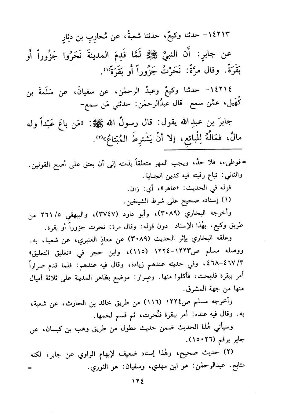 ١٤٢١٤ - حَدَّثَنَا وَكِيعٌ، وَعَبْدُ الرَّحْمَنِ، عَنْ سُفْيَانَ، عَنْ سَلَمَةَ بْنِ كُهَيْلٍ، عَمَّنْ سَمِعَ، قَالَ عَبْدُ الرَّحْمَنِ: حَدَّثَنِي مَنْ سَمِعَ جَابِرَ بْنَ عَبْدِ اللهِ، يَقُولُ: قَالَ رَسُولُ اللهِ صَلَّى اللهُ عَلَيْهِ وَسَلَّمَ: " مَنْ بَاعَ عَبْدًا وَلَهُ مَالٌ، فَمَالُهُ لِلْبَائِعِ، إِلَّا أَنْ يَشْتَرِطَ الْمُبْتَاعُ " (٢)