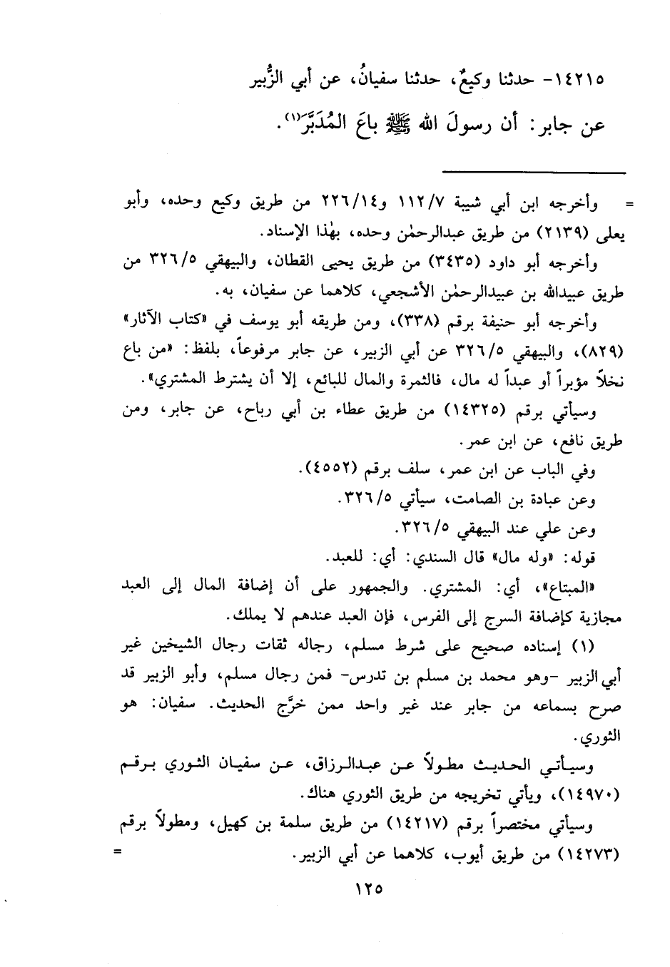 ١٤٢١٥ - حَدَّثَنَا وَكِيعٌ، حَدَّثَنَا سُفْيَانُ، عَنْ أَبِي الزُّبَيْرِ، عَنْ جَابِرٍ، " أَنَّ رَسُولَ اللهِ صَلَّى اللهُ عَلَيْهِ وَسَلَّمَ، بَاعَ الْمُدَبَّرَ " (١)