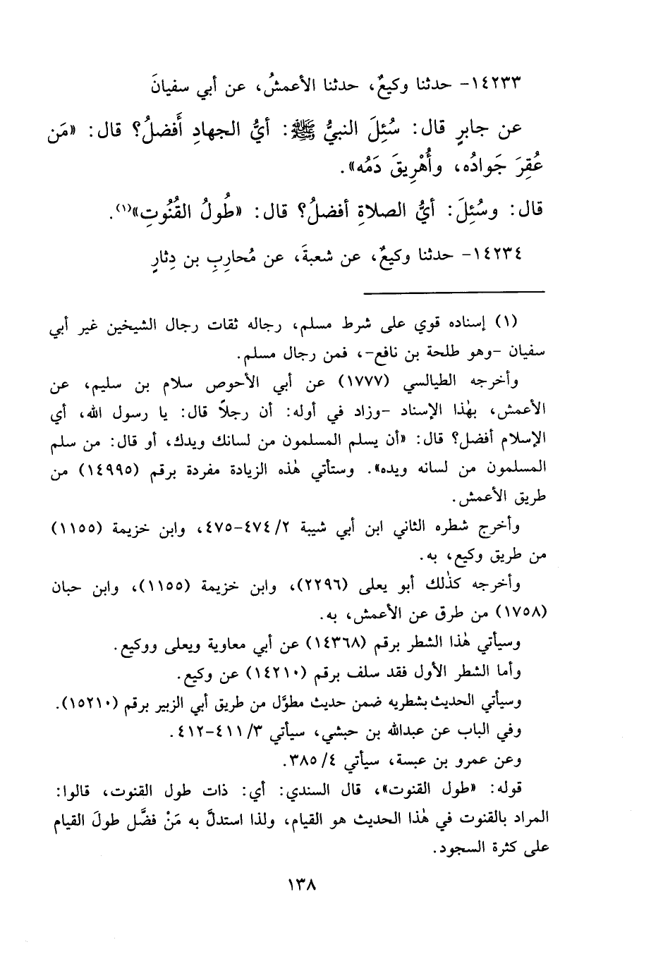 ١٤٢٣٣ - حَدَّثَنَا وَكِيعٌ، حَدَّثَنَا الْأَعْمَشُ، عَنْ أَبِي سُفْيَانَ، عَنْ جَابِرٍ، قَالَ: سُئِلَ النَّبِيُّ صَلَّى اللهُ عَلَيْهِ وَسَلَّمَ: أَيُّ الْجِهَادِ أَفْضَلُ؟ قَالَ: " مَنْ عُقِرَ جَوَادُهُ، وَأُهْرِيقَ دَمُهُ "