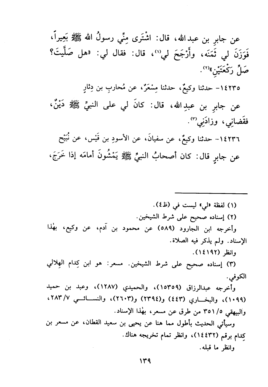 ١٤٢٣٥ - حَدَّثَنَا وَكِيعٌ، حَدَّثَنَا مِسْعَرٌ، عَنْ مُحَارِبِ بْنِ دِثَارٍ، عَنْ جَابِرِ بْنِ عَبْدِ اللهِ، قَالَ: " كَانَ لِي عَلَى النَّبِيِّ صَلَّى اللهُ عَلَيْهِ وَسَلَّمَ دَيْنٌ، فَقَضَانِي وَزَادَنِي " (٣)