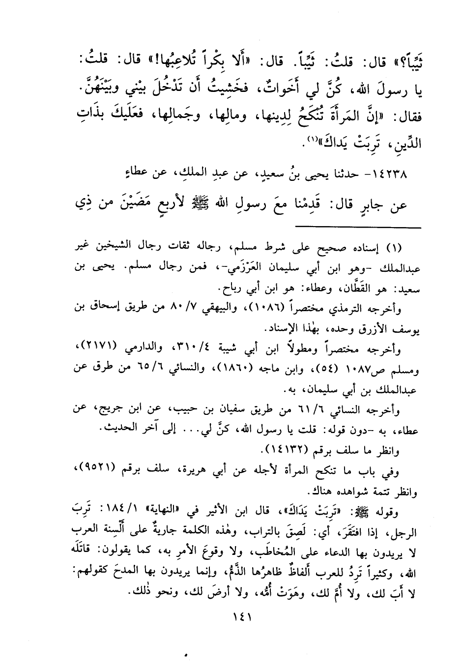 ثَيِّبًا؟ "، قَالَ: قُلْتُ: ثَيِّبًا، قَالَ: " أَلَا بِكْرًا تُلَاعِبُهَا "، قَالَ: قُلْتُ: يَا رَسُولَ اللهِ، كُنَّ لِي أَخَوَاتٌ، فَخَشِيتُ أَنْ تَدْخُلَ بَيْنِي وَبَيْنَهُنَّ، فَقَالَ: " إِنَّ الْمَرْأَةَ تُنْكَحُ لَدِينِهَا، وَمَالِهَا، وَجَمَالِهَا، فَعَلَيْكَ بِذَاتِ الدِّينِ، تَرِبَتْ يَدَاكَ " (١)