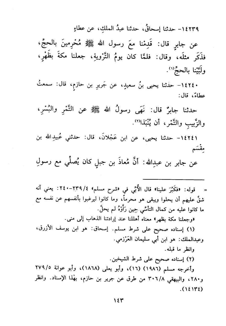 ١٤٢٣٩ - حَدَّثَنَا إِسْحَاقُ، حَدَّثَنَا عَبْدُ الْمَلِكِ، عَنْ عَطَاءٍ، عَنْ جَابِرٍ، قَالَ: قَدِمْنَا مَعَ رَسُولِ اللهِ صَلَّى اللهُ عَلَيْهِ وَسَلَّمَ مُحْرِمِينَ بِالْحَجِّ، فَذَكَرَ مِثْلَهُ، وَقَالَ: فَلَمَّا كَانَ يَوْمُ التَّرْوِيَةِ، جَعَلْنَا مَكَّةَ بِظَهْرٍ، لَبَّيْنَا بِالْحَجِّ (١)