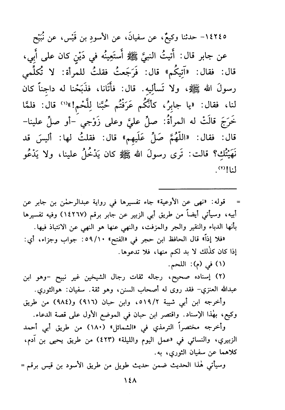 ١٤٢٤٥ - حَدَّثَنَا وَكِيعٌ، عَنْ سُفْيَانَ، عَنْ الْأَسْوَدِ بْنِ قَيْسٍ، عَنْ نُبَيْحٍ، عَنْ جَابِرٍ، قَالَ: أَتَيْتُ النَّبِيَّ صَلَّى اللهُ عَلَيْهِ وَسَلَّمَ أَسْتَعِينُهُ فِي دَيْنٍ كَانَ عَلَى أَبِي، قَالَ: فَقَالَ: " آتِيكُمْ "، قَالَ: فَرَجَعْتُ، فَقُلْتُ لِلْمَرْأَةِ: لَا تُكَلِّمِي رَسُولَ اللهِ صَلَّى اللهُ عَلَيْهِ وَسَلَّمَ، وَلَا تَسْأَلِيهِ، قَالَ: فَأَتَانَا فَذَبَحْنَا لَهُ دَاجِنًا كَانَ لَنَا، فَقَالَ: " يَا جَابِرُ، كَأَنَّكُمْ عَرَفْتُمْ حُبَّنَا اللَّحْمَ " (١) ، قَالَ: فَلَمَّا خَرَجَ، قَالَتْ لَهُ الْمَرْأَةُ: صَلِّ عَلَيَّ وَعَلَى زَوْجِي - أَوْ صَلِّ عَلَيْنَا -، قَالَ: فَقَالَ: " اللهُمَّ صَلِّ عَلَيْهِمْ "، قَالَ: فَقُلْتُ لَهَا: أَلَيْسَ قَدْ نَهَيْتُكِ، قَالَتْ: تَرَى رَسُولَ اللهِ صَلَّى اللهُ عَلَيْهِ وَسَلَّمَ كَانَ يَدْخُلُ عَلَيْنَا، وَلَا يَدْعُو لَنَا (٢)