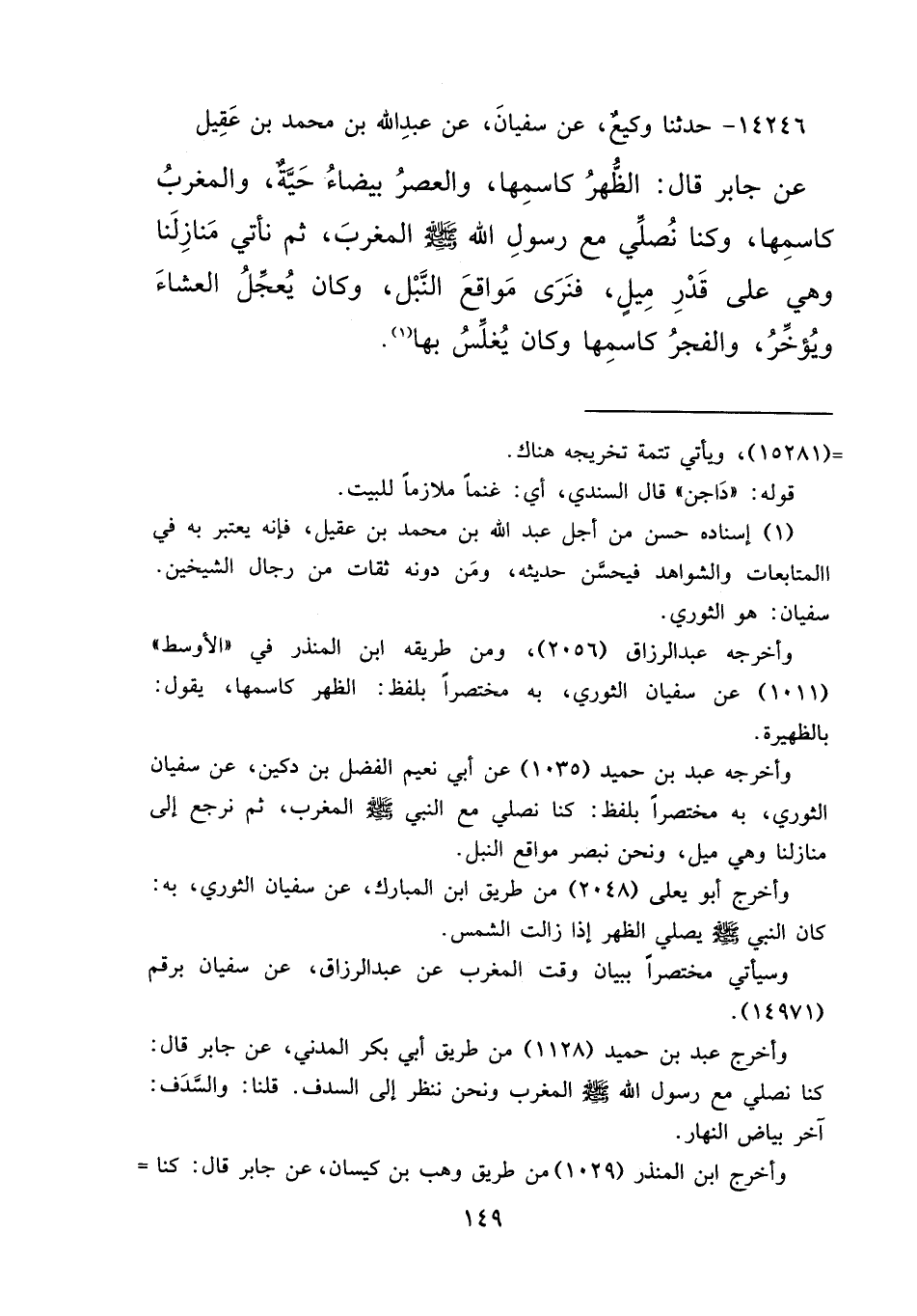 ١٤٢٤٦ - حَدَّثَنَا وَكِيعٌ، عَنْ سُفْيَانَ، عَنْ عَبْدِ اللهِ بْنِ مُحَمَّدِ بْنِ عَقِيلٍ، عَنْ جَابِرٍ، قَالَ: " الظُّهْرُ كَاسْمِهَا، وَالْعَصْرُ بَيْضَاءُ حَيَّةٌ، وَالْمَغْرِبُ كَاسْمِهَا، وَكُنَّا نُصَلِّي مَعَ رَسُولِ اللهِ صَلَّى اللهُ عَلَيْهِ وَسَلَّمَ الْمَغْرِبَ، ثُمَّ نَأْتِي مَنَازِلَنَا، وَهِيَ عَلَى قَدْرِ مِيلٍ، فَنَرَى مَوَاقِعَ النَّبْلِ، وَكَانَ يُعَجِّلُ الْعِشَاءَ وَيُؤَخِّرُ، وَالْفَجْرُ كَاسْمِهَا، وَكَانَ يُغَلِّسُ بِهَا " (١)