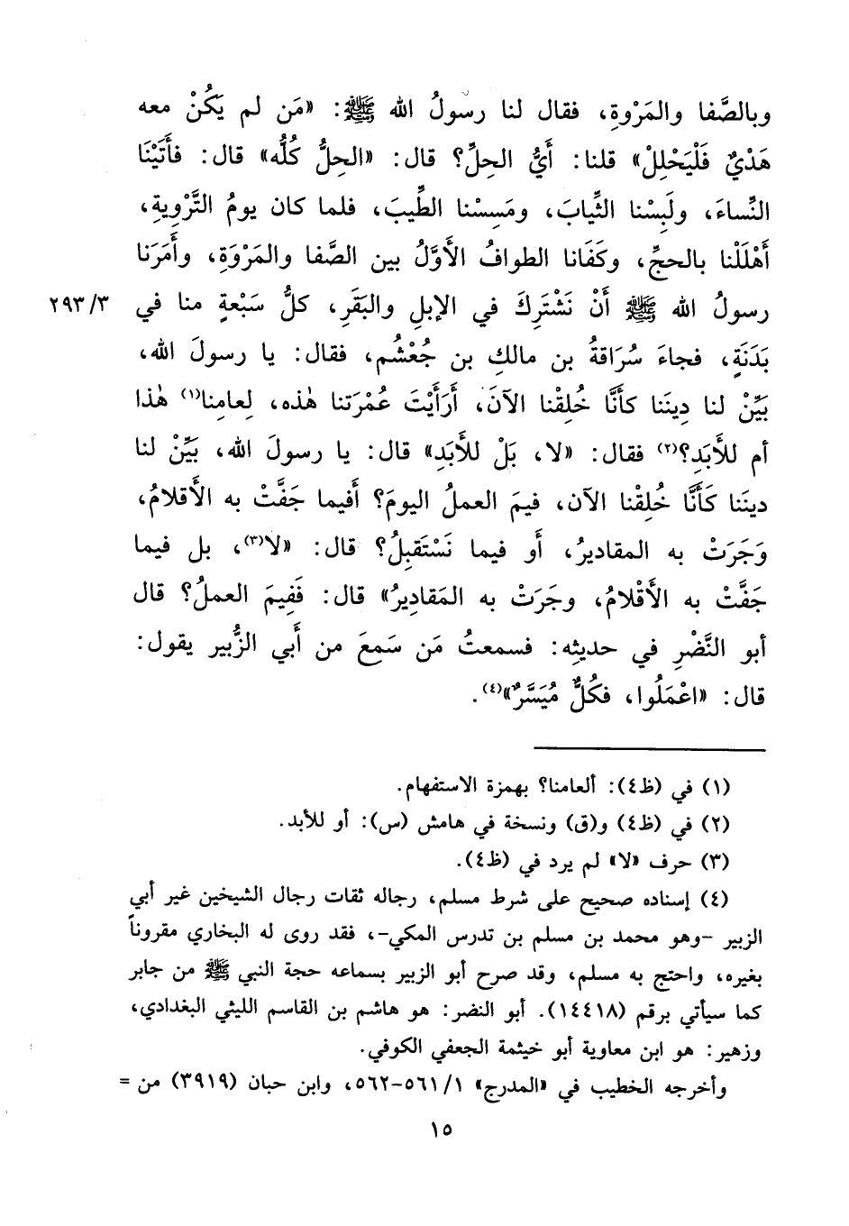 وَبِالصَّفَا، وَالْمَرْوَةِ، فَقَالَ لَنَا رَسُولُ اللهِ صَلَّى اللهُ عَلَيْهِ وَسَلَّمَ: " مَنْ لَمْ يَكُنْ مَعَهُ هَدْيٌ فَلْيَحْلِلْ "، قُلْنَا: أَيُّ الْحِلِّ قَالَ: " الْحِلُّ كُلُّهُ "، قَالَ: فَأَتَيْنَا النِّسَاءَ، وَلَبِسْنَا الثِّيَابَ، وَمَسِسْنَا الطِّيبَ، فَلَمَّا كَانَ يَوْمُ التَّرْوِيَةِ أَهْلَلْنَا بِالْحَجِّ، وَكَفَانَا الطَّوَافُ الْأَوَّلُ بَيْنَ الصَّفَا، وَالْمَرْوَةِ، وَأَمَرَنَا رَسُولُ اللهِ صَلَّى اللهُ عَلَيْهِ وَسَلَّمَ أَنْ نَشْتَرِكَ فِي الْإِبِلِ وَالْبَقَرِ، كُلُّ سَبْعَةٍ مِنَّا فِي بَدَنَةٍ، فَجَاءَ سُرَاقَةُ بْنُ مَالِكِ بْنِ جُعْشُمٍ، فَقَالَ: يَا رَسُولَ اللهِ، بَيِّنْ لَنَا دِينَنَا كَأَنَّا خُلِقْنَا الْآنَ، أَرَأَيْتَ عُمْرَتَنَا هَذِهِ لِعَامِنَا (١) هَذَا أَمْ لِلْأَبَدِ؟ (٢) فَقَالَ: " لَا، بَلْ لِلْأَبَدِ "، قَالَ: يَا رَسُولَ اللهِ، بَيِّنْ لَنَا دِينَنَا كَأَنَّا خُلِقْنَا الْآنَ، فِيمَ الْعَمَلُ الْيَوْمَ؟ أَفِيمَا جَفَّتْ بِهِ الْأَقْلَامُ، وَجَرَتْ بِهِ الْمَقَادِيرُ، أَوْ فِيمَا نَسْتَقْبِلُ؟ قَالَ: " لَا، (٣) بَلْ فِيمَا جَفَّتْ بِهِ الْأَقْلَامُ، وَجَرَتْ بِهِ الْمَقَادِيرُ " قَالَ: فَفِيمَ الْعَمَلُ؟ قَالَ أَبُو النَّضْرِ فِي حَدِيثِهِ: فَسَمِعْتُ مَنْ سَمِعَ مِنْ أَبِي الزُّبَيْرِ، يَقُولُ: قَالَ: " اعْمَلُوا، فَكُلٌّ مُيَسَّرٌ "، (٤)