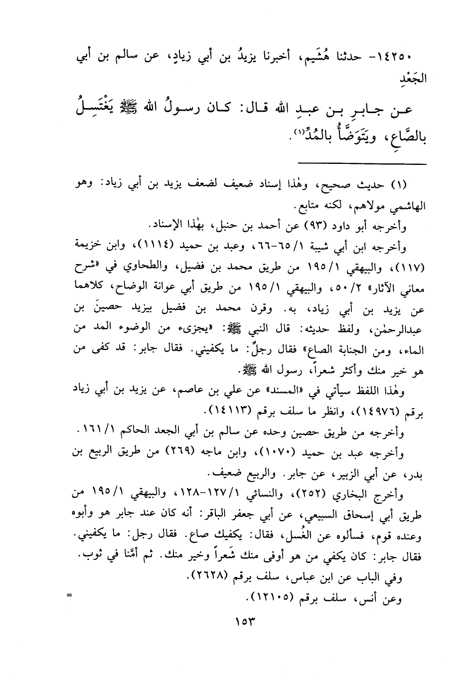 ١٤٢٥٠ - حَدَّثَنَا هُشَيْمٌ، أَخْبَرَنَا يَزِيدُ بْنُ أَبِي زِيَادٍ، عَنْ سَالِمِ بْنِ أَبِي الْجَعْدِ، عَنْ جَابِرِ بْنِ عَبْدِ اللهِ، قَالَ: " كَانَ رَسُولُ اللهِ صَلَّى اللهُ عَلَيْهِ وَسَلَّمَ يَغْتَسِلُ بِالصَّاعِ، وَيَتَوَضَّأُ بِالْمُدِّ " (١)