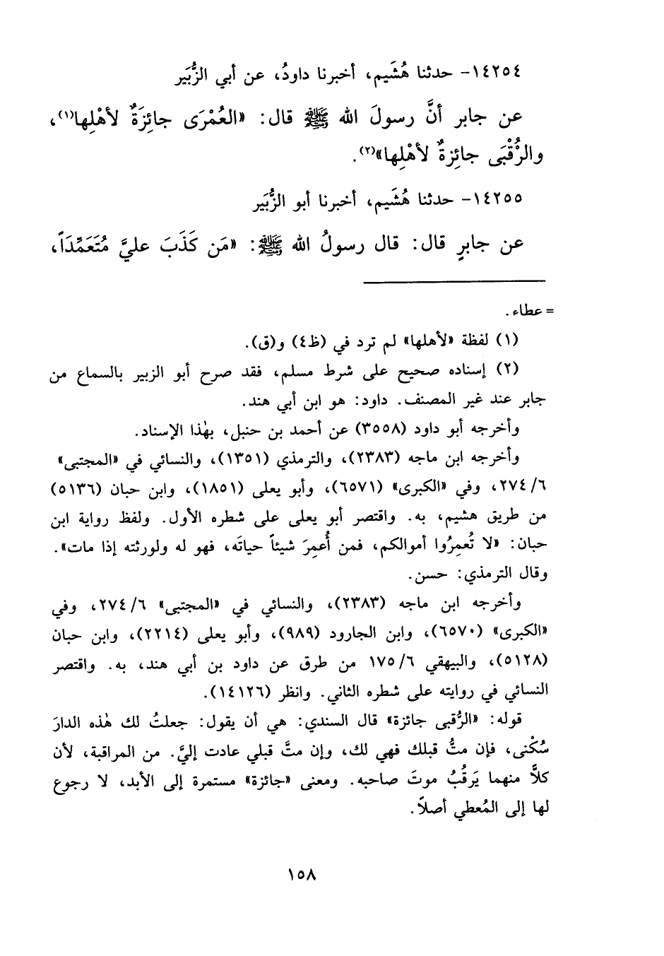 ١٤٢٥٤ - حَدَّثَنَا هُشَيْمٌ، أَخْبَرَنَا دَاوُدُ، عَنْ أَبِي الزُّبَيْرِ، عَنْ جَابِرٍ، أَنَّ رَسُولَ اللهِ صَلَّى اللهُ عَلَيْهِ وَسَلَّمَ قَالَ: " الْعُمْرَى جَائِزَةٌ لِأَهْلِهَا، (١) وَالرُّقْبَى جَائِزَةٌ لِأَهْلِهَا " (٢)