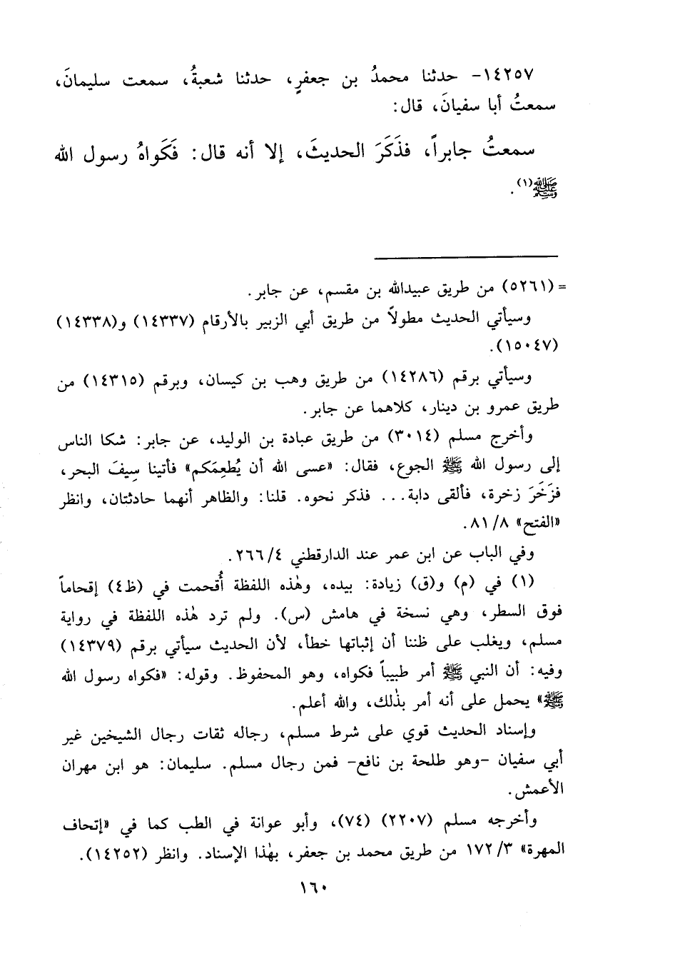 ١٤٢٥٧ - حَدَّثَنَا مُحَمَّدُ بْنُ جَعْفَرٍ حَدَّثَنَا شُعْبَةُ سَمِعْتُ سُلَيْمَانَ سَمِعْتُ أَبَا سُفْيَانَ، قَالَ: سَمِعْتُ جَابِرًا، فَذَكَرَ الْحَدِيثَ إِلَّا أَنَّهُ قَالَ: فَكَوَاهُ رَسُولُ اللهِ صَلَّى اللهُ عَلَيْهِ وَسَلَّمَ (١)