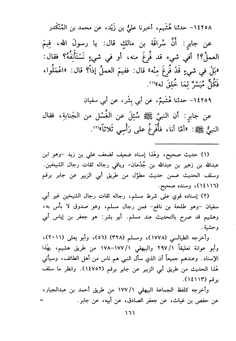 ١٤٢٥٩ - حَدَّثَنَا هُشَيْمٌ، عَنْ أَبِي بِشْرٍ، عَنْ أَبِي سُفْيَانَ، عَنْ جَابِرٍ، أَنَّ النَّبِيَّ صَلَّى اللهُ عَلَيْهِ وَسَلَّمَ سُئِلَ عَنِ الْغُسْلِ مِنَ الْجَنَابَةِ، فَقَالَ النَّبِيُّ صَلَّى اللهُ عَلَيْهِ وَسَلَّمَ: " أَمَّا أَنَا فَأُفْرِغُ عَلَى رَأْسِي ثَلَاثًا " (٢)