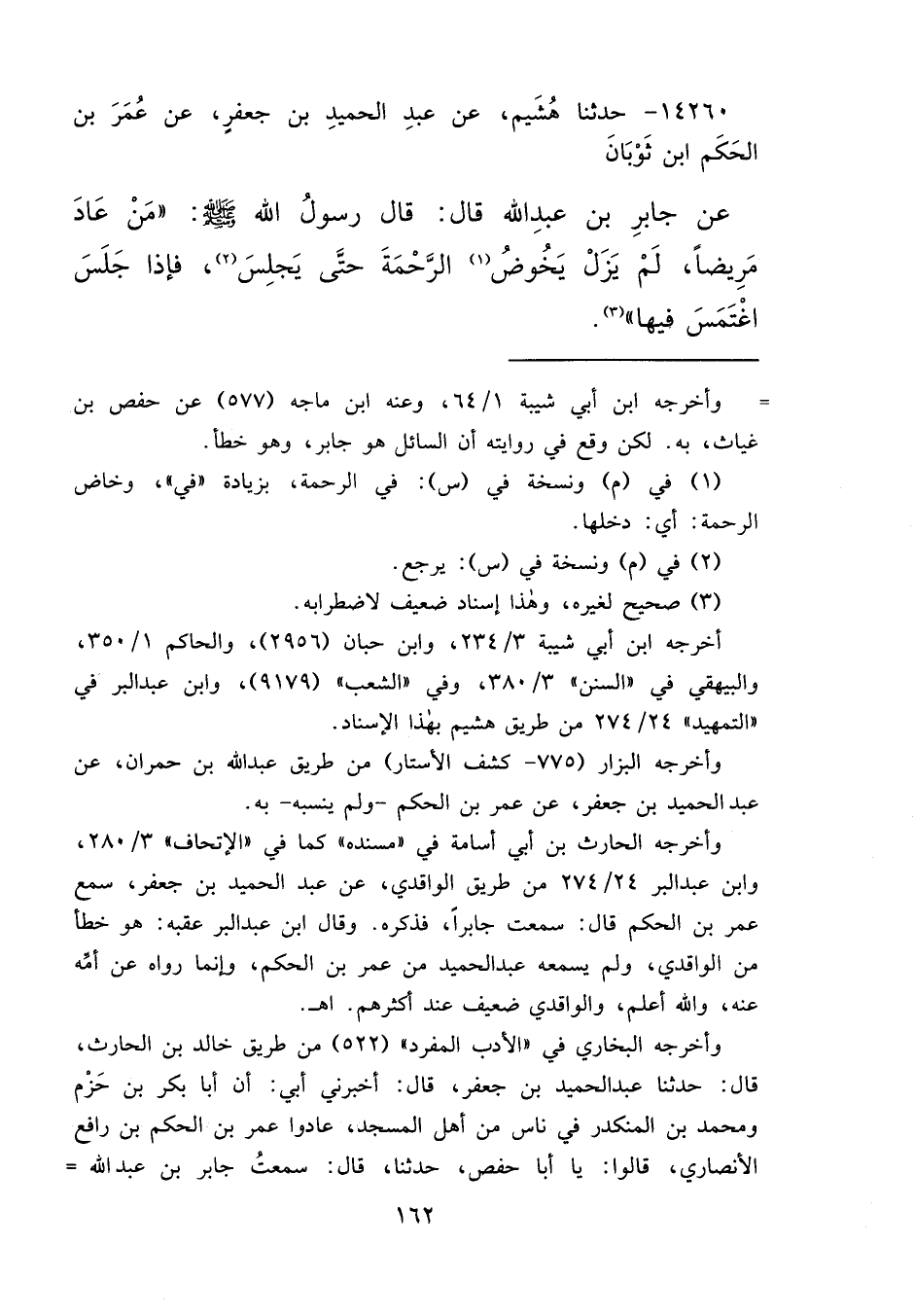 ١٤٢٦٠ - حَدَّثَنَا هُشَيْمٌ، عَنْ عَبْدِ الْحَمِيدِ بْنِ جَعْفَرٍ، عَنْ عُمَرَ بْنِ الْحَكَمِ بْنِ ثَوْبَانَ، عَنْ جَابِرِ بْنِ عَبْدِ اللهِ، قَالَ: قَالَ رَسُولُ اللهِ صَلَّى اللهُ عَلَيْهِ وَسَلَّمَ: " مَنْ عَادَ مَرِيضًا، لَمْ يَزَلْ يَخُوضُ (١) فِي الرَّحْمَةِ حَتَّى يَجْلِسَ، (٢) فَإِذَا جَلَسَ اغْتَمَسَ فِيهَا " (٣)