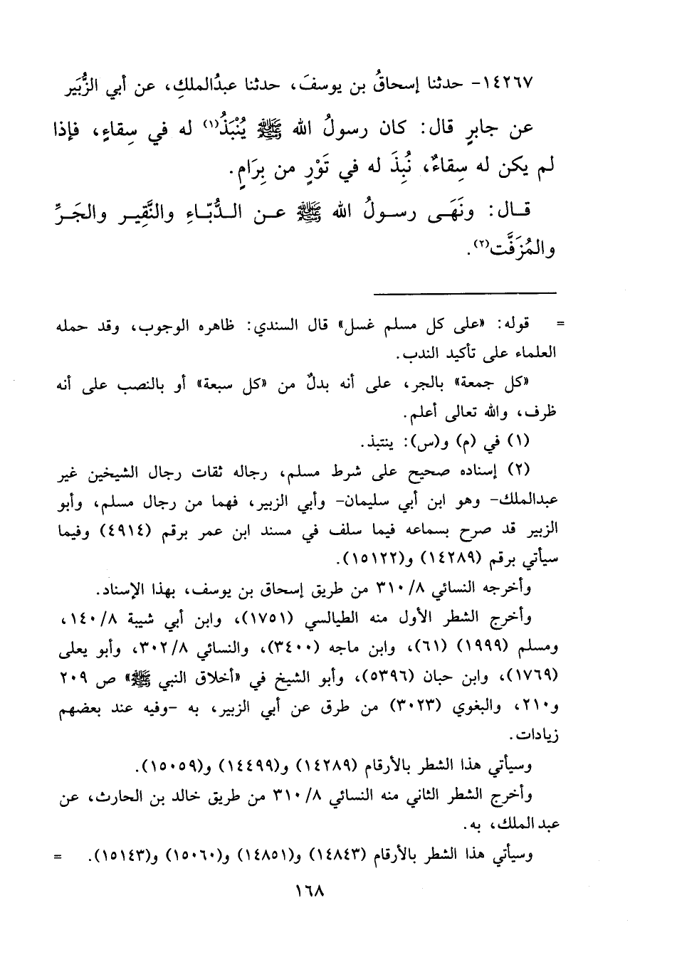 ١٤٢٦٧ - حَدَّثَنَا إِسْحَاقُ بْنُ يُوسُفَ، حَدَّثَنَا عَبْدُ الْمَلِكِ، عَنْ أَبِي الزُّبَيْرِ، عَنْ جَابِرٍ، قَالَ: " كَانَ رَسُولُ اللهِ صَلَّى اللهُ عَلَيْهِ وَسَلَّمَ يَنْبِذُ (١) لَهُ فِي سِقَاءٍ، فَإِذَا لَمْ يَكُنْ لَهُ سِقَاءٌ، نُبِذَ لَهُ فِي تَوْرٍ مِنْ بِرَامٍ "