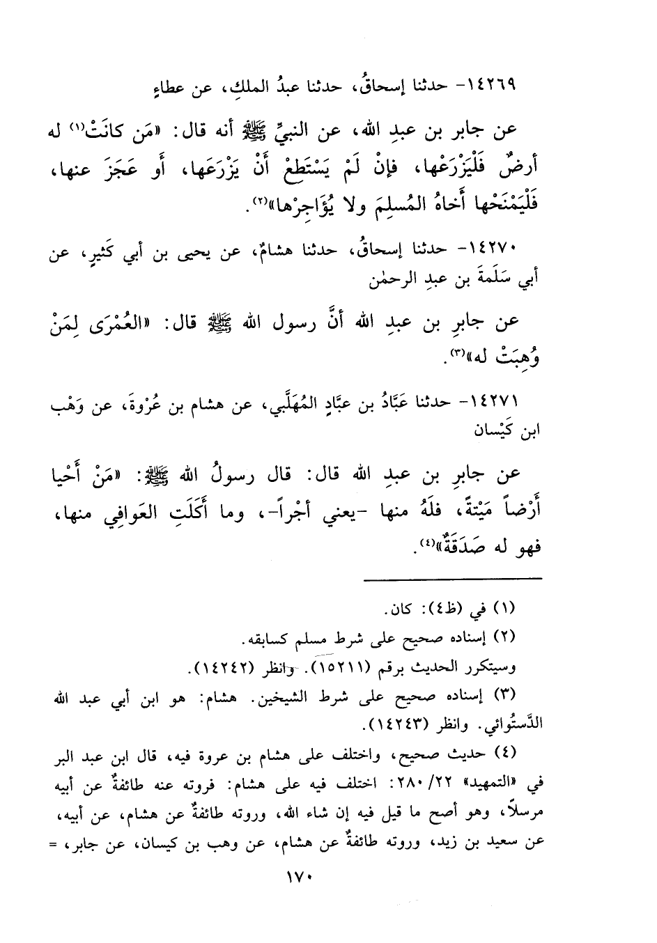 ١٤٢٧١ - حَدَّثَنَا عَبَّادُ بْنُ عَبَّادٍ الْمُهَلَّبِيُّ، عَنْ هِشَامِ بْنِ عُرْوَةَ، عَنْ وَهْبِ بْنِ كَيْسَانَ، عَنْ جَابِرِ بْنِ عَبْدِ اللهِ، قَالَ: قَالَ رَسُولُ اللهِ صَلَّى اللهُ عَلَيْهِ وَسَلَّمَ: " مَنْ أَحْيَا أَرْضًا مَيْتَةً، فَلَهُ مِنْهَا - يَعْنِي أَجْرًا -، وَمَا أَكَلَتِ الْعَوَافِي مِنْهَا، فَهُوَ لَهُ صَدَقَةٌ " (٤)