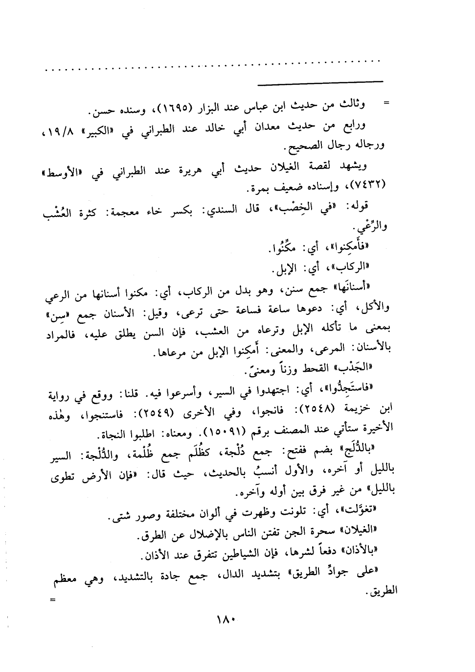 "أسنانَها" جمع سنن، وهو بدل من الركاب، أي: مكنوا أسنانها من الرعي والأكل، أي: دعوها ساعة فساعة حتى ترعى، وقيل: الأسنان جمع "سِن" بمعنى ما تأكله الإبل وترعاه من العشب، فإن السن يطلق عليه، فالمراد بالأسنان: المرعى، والمعنى: أَمكِنوا الإبل من مرعاها.