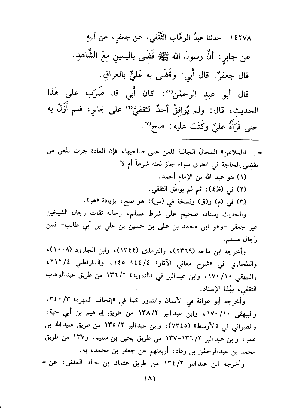 ١٤٢٧٨ - حَدَّثَنَا عَبْدُ الْوَهَّابِ الثَّقَفِيُّ، عَنْ جَعْفَرٍ، عَنْ أَبِيهِ، عَنْ جَابِرٍ، " أَنَّ رَسُولَ اللهِ صَلَّى اللهُ عَلَيْهِ وَسَلَّمَ قَضَى بِالْيَمِينِ مَعَ الشَّاهِدِ "، قَالَ جَعْفَرٌ: قَالَ أَبِي: " وَقَضَى بِهِ عَلِيٌّ بِالْعِرَاقِ "، قَالَ أَبُو عَبْدِ الرَّحْمَنِ: (١) " كَانَ أَبِي قَدْ ضَرَبَ عَلَى هَذَا الْحَدِيثِ، قَالَ: وَلَمْ يُوَافِقْ أَحَدٌ الثَّقَفِيَّ (٢) عَلَى جَابِرٍ، فَلَمْ أَزَلْ بِهِ حَتَّى قَرَأَهُ عَلَيَّ، وَكَتَبَ عَلَيْهِ صَحَّ " (٣)
