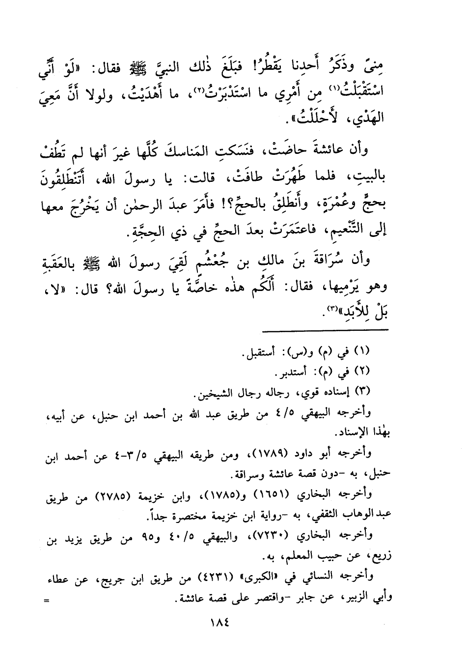 مِنًى، وَذَكَرُ أَحَدِنَا يَقْطُرُ فَبَلَغَ النَّبِيَّ صَلَّى اللهُ عَلَيْهِ وَسَلَّمَ فَقَالَ: " لَوْ أَنِّي اسْتَقْبَلْتُ (١) مِنْ أَمْرِي مَا اسْتَدْبَرْتُ، (٢) مَا أَهْدَيْتُ، وَلَوْلَا أَنَّ مَعِي الْهَدْيَ لَأَحْلَلْتُ "، وَأَنَّ عَائِشَةَ حَاضَتْ، فَنَسَكَتْ الْمَنَاسِكَ كُلَّهَا غَيْرَ أَنَّهَا لَمْ تَطُفْ بِالْبَيْتِ، فَلَمَّا طَهُرَتْ طَافَتْ، قَالَتْ: يَا رَسُولَ اللهِ، أَتَنْطَلِقُونَ بِحَجٍّ وَعُمْرَةٍ، وَأَنْطَلِقُ بِالْحَجِّ؟ فَأَمَرَ عَبْدَ الرَّحْمَنِ أَنْ يَخْرُجَ مَعَهَا إِلَى التَّنْعِيمِ، فَاعْتَمَرَتْ بَعْدَ الْحَجِّ فِي ذِي الْحِجَّةِ، وَأَنَّ سُرَاقَةَ بْنَ مَالِكِ بْنِ جُعْشُمٍ لَقِيَ رَسُولَ اللهِ صَلَّى اللهُ عَلَيْهِ وَسَلَّمَ بِالْعَقَبَةِ وَهُوَ يَرْمِيهَا، فَقَالَ: أَلَكُمْ هَذِهِ خَاصَّةً يَا رَسُولَ اللهِ؟ قَالَ: " لَا، بَلْ لِلْأَبَدِ " (٣)