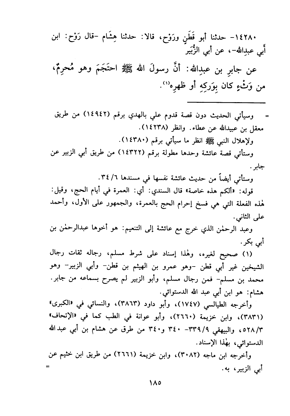 ١٤٢٨٠ - حَدَّثَنَا أَبُو قَطَنٍ، وَرَوْحٌ، قَالَا: حَدَّثَنَا هِشَامٌ، قَالَ رَوْحٌ ابْنُ أَبِي عَبْدِ اللهِ: عَنْ أَبِي الزُّبَيْرِ، عَنْ جَابِرِ بْنِ عَبْدِ اللهِ، " أَنَّ رَسُولَ اللهِ صَلَّى اللهُ عَلَيْهِ وَسَلَّمَ احْتَجَمَ وَهُوَ مُحْرِمٌ، مِنْ وَثْءٍ كَانَ بِوَرِكِهِ - أَوْ ظَهْرِهِ - " (١)