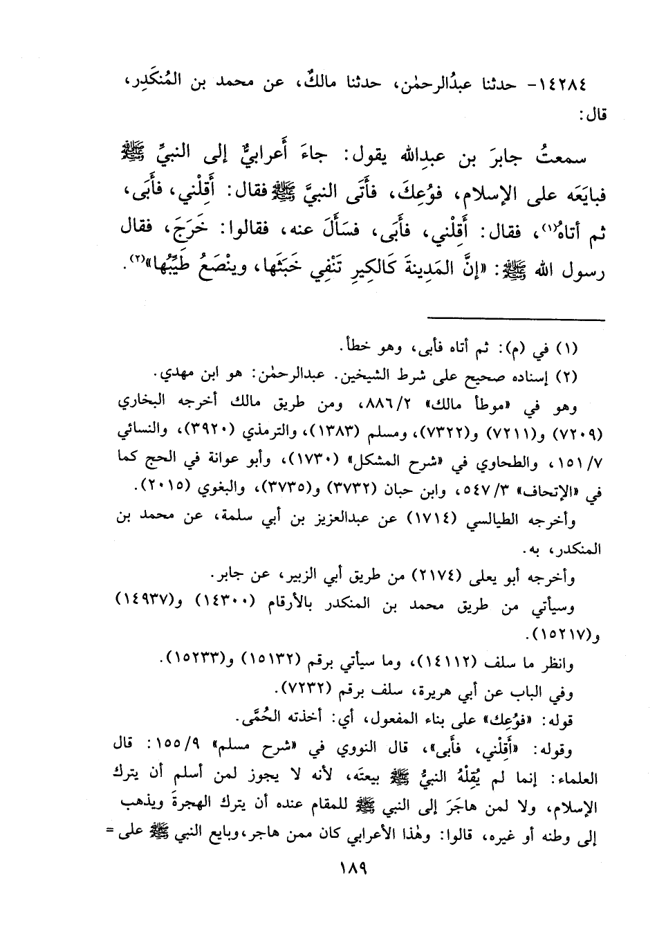 ١٤٢٨٤ - حَدَّثَنَا عَبْدُ الرَّحْمَنِ، حَدَّثَنَا مَالِكٌ، عَنْ مُحَمَّدِ بْنِ الْمُنْكَدِرِ، قَالَ: سَمِعْتُ جَابِرَ بْنَ عَبْدِ اللهِ، يَقُولُ: جَاءَ أَعْرَابِيٌّ إِلَى النَّبِيِّ صَلَّى اللهُ عَلَيْهِ وَسَلَّمَ فَبَايَعَهُ عَلَى الْإِسْلَامِ، فَوُعِكَ، فَأَتَى النَّبِيَّ صَلَّى اللهُ عَلَيْهِ وَسَلَّمَ فَقَالَ: أَقِلْنِي، فَأَبَى، ثُمَّ أَتَاهُ، (١) فَقَالَ: أَقِلْنِي، فَأَبَى، فَسَأَلَ عَنْهُ، فَقَالُوا: خَرَجَ، فَقَالَ رَسُولُ اللهِ صَلَّى اللهُ عَلَيْهِ وَسَلَّمَ: " إِنَّ الْمَدِينَةَ كَالْكِيرِ، تَنْفِي خَبَثَهَا، وَتَنْصَعُ طَيِّبَهَا " (٢)