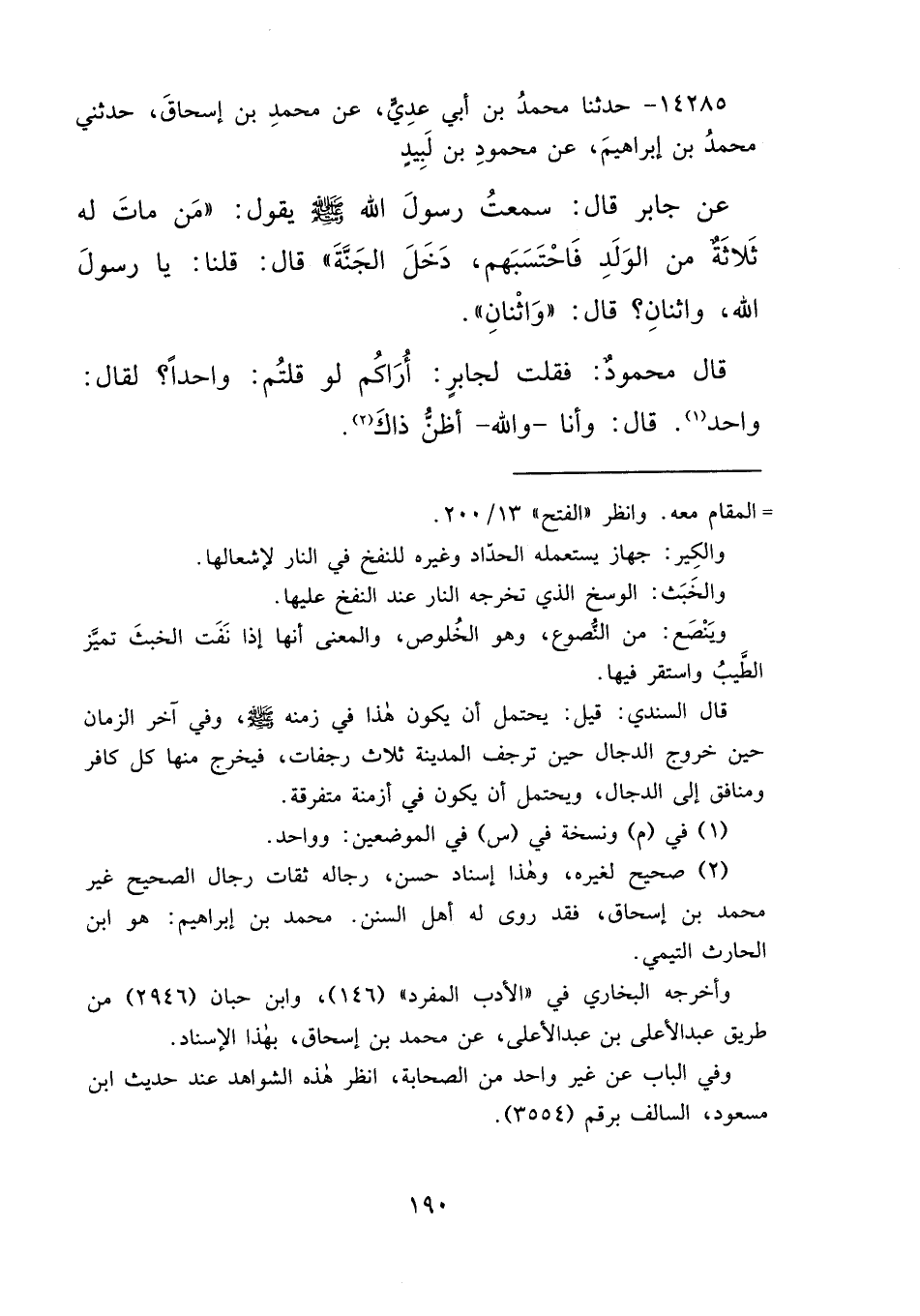 ١٤٢٨٥ - حَدَّثَنَا مُحَمَّدُ بْنُ أَبِي عَدِيٍّ، عَنْ مُحَمَّدِ بْنِ إِسْحَاقَ، حَدَّثَنِي مُحَمَّدُ بْنُ إِبْرَاهِيمَ، عَنْ مَحْمُودِ بْنِ لَبِيدٍ، عَنْ جَابِرٍ، قَالَ: سَمِعْتُ رَسُولَ اللهِ صَلَّى اللهُ عَلَيْهِ وَسَلَّمَ يَقُولُ: " مَنْ مَاتَ لَهُ ثَلَاثَةٌ مِنَ الْوَلَدِ، فَاحْتَسَبَهُمْ، دَخَلَ الْجَنَّةَ "، قَالَ: قُلْنَا: يَا رَسُولَ اللهِ: وَاثْنَانِ؟ قَالَ: " وَاثْنَانِ "، قَالَ مَحْمُودٌ: فَقُلْتُ لِجَابِرٍ: أَرَاكُمْ لَوْ قُلْتُمْ وَاحِدًا، لَقَالَ: وَاحِدٌ، (١) قَالَ: " وَأَنَا وَاللهِ أَظُنُّ ذَاكَ " (٢)