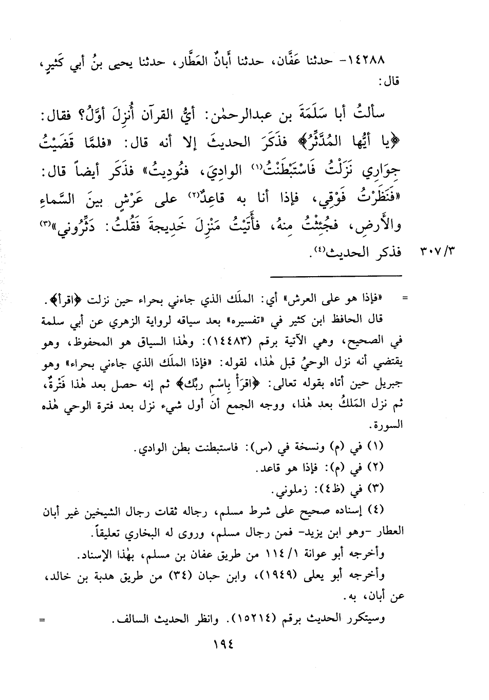 ١٤٢٨٨ - حَدَّثَنَا عَفَّانُ، حَدَّثَنَا أَبَانُ الْعَطَّارُ، حَدَّثَنَا يَحْيَى بْنُ أَبِي كَثِيرٍ، قَالَ: سَأَلْتُ أَبَا سَلَمَةَ بْنَ عَبْدِ الرَّحْمَنِ، أَيُّ الْقُرْآنِ أُنْزِلَ أَوَّلُ؟ فَقَالَ: يَا أَيُّهَا الْمُدَّثِّرُ، فَذَكَرَ الْحَدِيثَ، إِلَّا أَنَّهُ قَالَ: " فَلَمَّا قَضَيْتُ جِوَارِي، نَزَلْتُ فَاسْتَبْطَنْتُ (١) الْوَادِي فَنُودِيتُ "، فَذَكَرَ أَيْضًا قَالَ: " فَنَظَرْتُ فَوْقِي فَإِذَا أَنَا بِهِ قَاعِدٌ (٢) عَلَى عَرْشٍ بَيْنَ السَّمَاءِ وَالْأَرْضِ، فَجُئِثْتُ مِنْهُ، فَأَتَيْتُ مَنْزِلَ خَدِيجَةَ، فَقُلْتُ: دَثِّرُونِي (٣) "، فَذَكَرَ الْحَدِيثَ (٤)