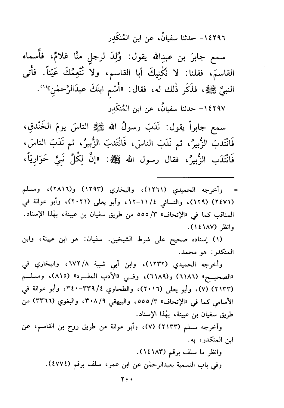 ١٤٢٩٦ - حَدَّثَنَا سُفْيَانُ، عَنِ ابْنِ الْمُنْكَدِرِ، سَمِعَ جَابِرَ بْنَ عَبْدِ اللهِ، يَقُولُ: وُلِدَ لِرَجُلٍ مِنَّا غُلَامٌ، فَأَسْمَاهُ الْقَاسِمَ، فَقُلْنَا: لَا نُكَنِّيكَ أَبَا الْقَاسِمِ، وَلَا نُنْعِمُكَ عَيْنًا، فَأَتَى النَّبِيَّ صَلَّى اللهُ عَلَيْهِ وَسَلَّمَ، فَذَكَرَ ذَلِكَ لَهُ، فَقَالَ: " أَسْمِ ابْنَكَ عَبْدَ الرَّحْمَنِ " (١)