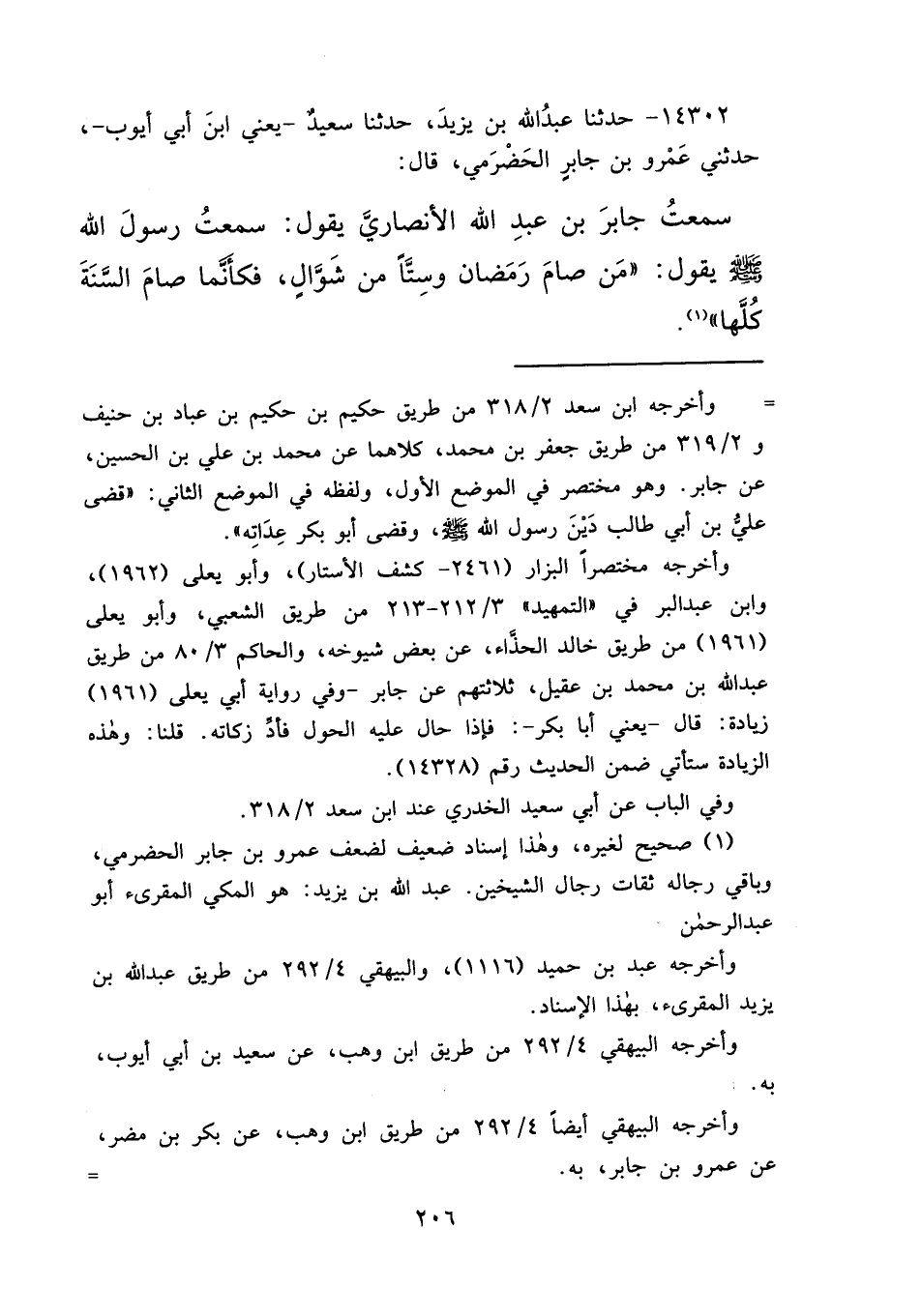 ١٤٣٠٢ - حَدَّثَنَا عَبْدُ اللهِ بْنُ يَزِيدَ، حَدَّثَنَا سَعِيدٌ يَعْنِي ابْنَ أَبِي أَيُّوبَ، حَدَّثَنِي عَمْرُو بْنُ جَابِرٍ الْحَضْرَمِيُّ، قَالَ: سَمِعْتُ جَابِرَ بْنَ عَبْدِ اللهِ الْأَنْصَارِيَّ، يَقُولُ: سَمِعْتُ رَسُولَ اللهِ صَلَّى اللهُ عَلَيْهِ وَسَلَّمَ يَقُولُ: " مَنْ صَامَ رَمَضَانَ، وَسِتًّا مِنْ شَوَّالٍ، فَكَأَنَّمَا صَامَ السَّنَةَ كُلَّهَا " (١) ،