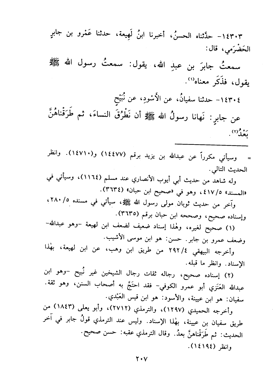 ١٤٣٠٤ - حَدَّثَنَا سُفْيَانُ، عَنِ الْأَسْوَدِ، عَنْ نُبَيْحٍ، عَنْ جَابِرٍ: " نَهَانَا رَسُولُ اللهِ صَلَّى اللهُ عَلَيْهِ وَسَلَّمَ، أَنْ نَطْرُقَ النِّسَاءَ، ثُمَّ طَرَقْنَاهُنَّ بَعْدُ " (٢)