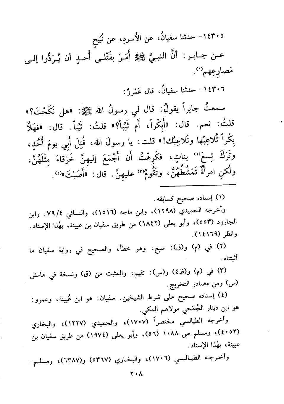 ١٤٣٠٦ - حَدَّثَنَا سُفْيَانُ، قَالَ عَمْرٌو: سَمِعْتُ جَابِرًا، يَقُولُ: قَالَ لِي رَسُولُ اللهِ صَلَّى اللهُ عَلَيْهِ وَسَلَّمَ: " هَلْ نَكَحْتَ؟ "، قُلْتُ: نَعَمْ، قَالَ: " أَبِكْرًا أَمْ ثَيِّبًا؟ "، قُلْتُ: ثَيِّبًا، قَالَ: " فَهَلَّا بِكْرًا تُلَاعِبُهَا، وَتُلَاعِبُكَ "، قُلْتُ: يَا رَسُولَ اللهِ، قُتِلَ أَبِي يَوْمَ أُحُدٍ، وَتَرَكَ تسْعَ (٢) بَنَاتٍ، فَكَرِهْتُ أَنْ أَجْمَعَ إِلَيْهِنَّ خَرْقَاءَ مِثْلَهُنَّ، وَلَكِنْ امْرَأَةً تُمَشِّطُهُنَّ، وَتَقُومُ (٣) عَلَيْهِنَّ، قَالَ: " أَصَبْتَ " (٤)