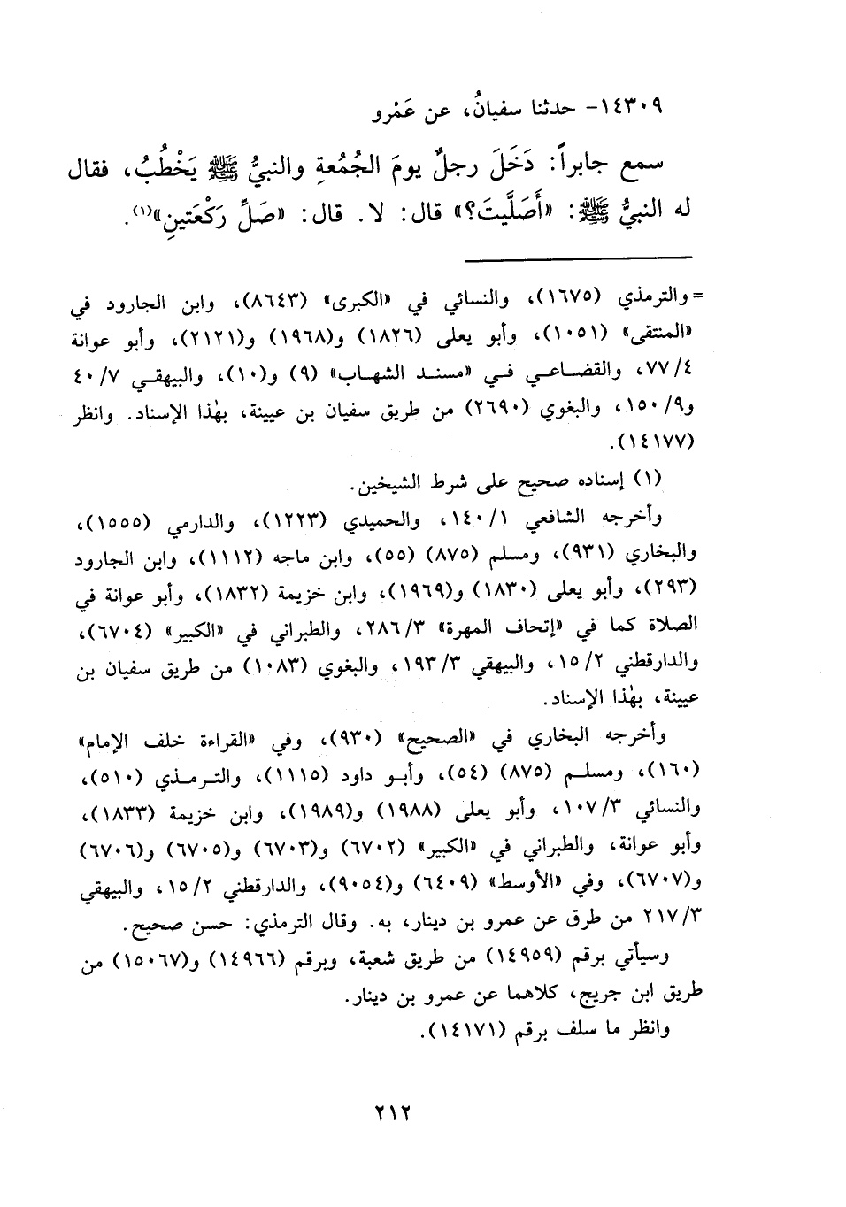 ١٤٣٠٩ - حَدَّثَنَا سُفْيَانُ، عَنْ عَمْرٍو، سَمِعَ جَابِرًا: دَخَلَ رَجُلٌ يَوْمَ الْجُمُعَةِ، وَالنَّبِيُّ صَلَّى اللهُ عَلَيْهِ وَسَلَّمَ يَخْطُبُ، فَقَالَ لَهُ النَّبِيُّ صَلَّى اللهُ عَلَيْهِ وَسَلَّمَ: " أَصَلَّيْتَ؟ "، قَالَ: لَا، قَالَ: " صَلِّ رَكْعَتَيْنِ " (١)
