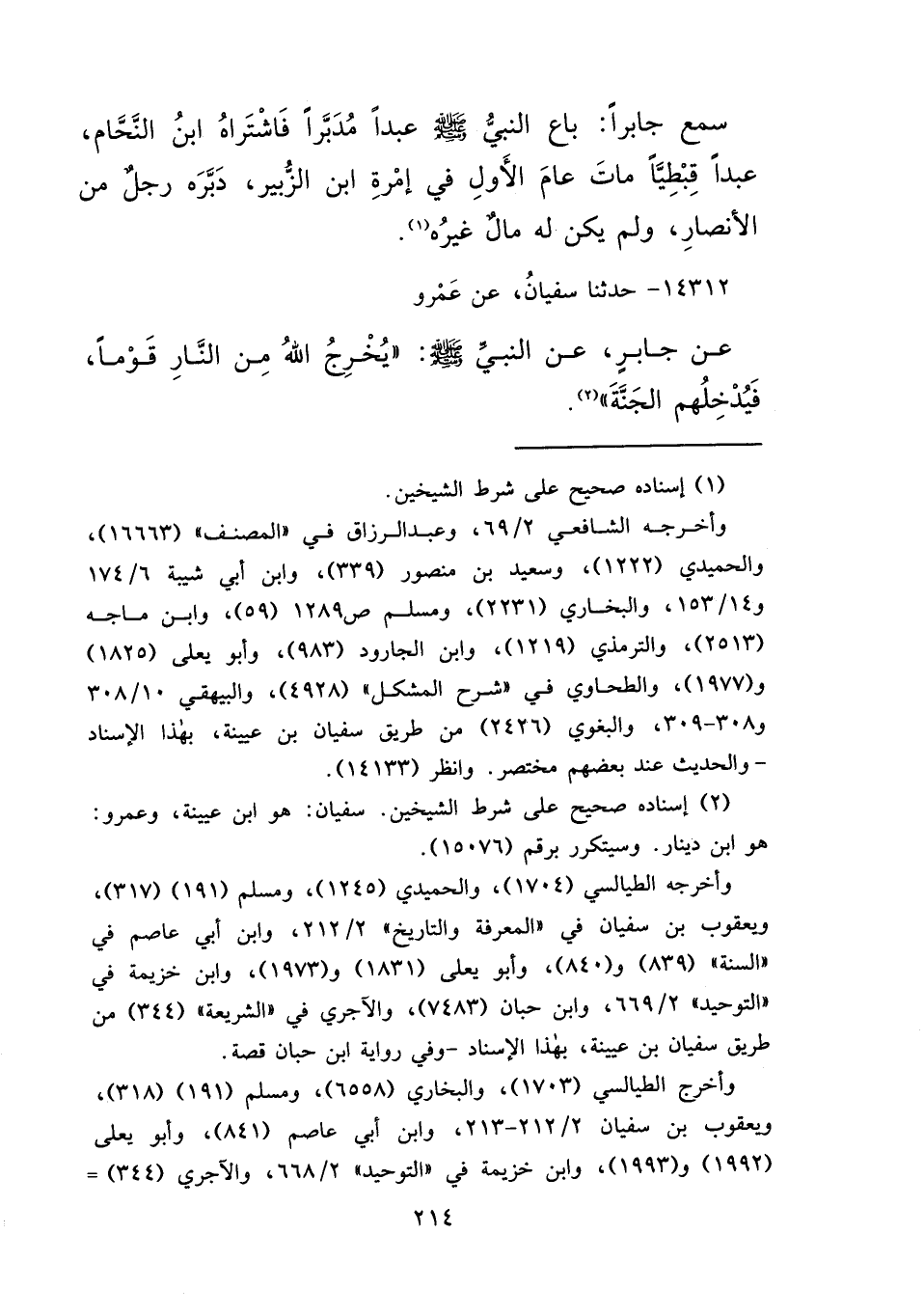 ١٤٣١٢ - حَدَّثَنَا سُفْيَانُ، عَنْ عَمْرٍو، عَنْ جَابِرٍ، عَنِ النَّبِيِّ صَلَّى اللهُ عَلَيْهِ وَسَلَّمَ: " يُخْرِجُ اللهُ مِنَ النَّارِ قَوْمًا، فَيُدْخِلُهُمُ الْجَنَّةَ " (٢)
