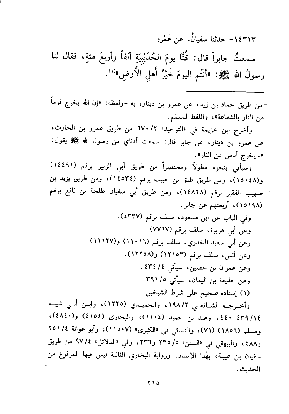 ١٤٣١٣ - حَدَّثَنَا سُفْيَانُ، عَنْ عَمْرٍو، سَمِعْتُ جَابِرًا، قَالَ: كُنَّا يَوْمَ الْحُدَيْبِيَةِ أَلْفًا وَأَرْبَعَ مِائَةٍ، فَقَالَ لَنَا رَسُولُ اللهِ صَلَّى اللهُ عَلَيْهِ وَسَلَّمَ: " أَنْتُمُ الْيَوْمَ خَيْرُ أَهْلِ الْأَرْضِ " (١)