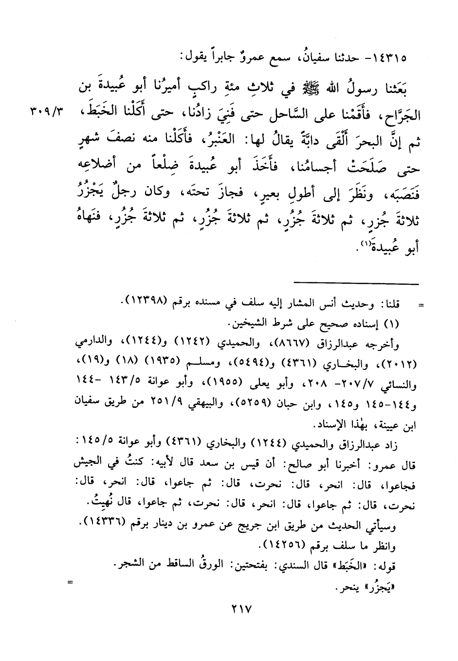 ١٤٣١٥ - حَدَّثَنَا سُفْيَانُ، سَمِعَ عَمْرٌو، جَابِرًا يَقُولُ: " بَعَثَنَا رَسُولُ اللهِ صَلَّى اللهُ عَلَيْهِ وَسَلَّمَ فِي ثَلَاثِ مِائَةِ رَاكِبٍ أَمِيرُنَا أَبُو عُبَيْدَةَ بْنُ الْجَرَّاحِ، فَأَقَمْنَا عَلَى السَّاحِلِ حَتَّى فَنِيَ زَادُنَا، حَتَّى أَكَلْنَا الْخَبَطَ، ثُمَّ إِنَّ الْبَحْرَ أَلْقَى دَابَّةً، يُقَالُ: لَهَا الْعَنْبَرُ، فَأَكَلْنَا مِنْهُ نِصْفَ شَهْرٍ، حَتَّى صَلَحَتْ أَجْسَامُنَا، فَأَخَذَ أَبُو عُبَيْدَةَ ضِلَعًا مِنْ أَضْلَاعِهِ فَنَصَبَهُ، وَنَظَرَ إِلَى أَطْوَلِ بَعِيرٍ، فَجَازَ تَحْتَهُ، وَكَانَ رَجُلٌ يَجْزُرُ ثَلَاثَةَ جُزُرٍ، ثُمَّ ثَلَاثَةَ جُزُرٍ، ثُمَّ ثَلَاثَةَ جُزُرٍ، فَنَهَاهُ أَبُو عُبَيْدَةَ " (١)