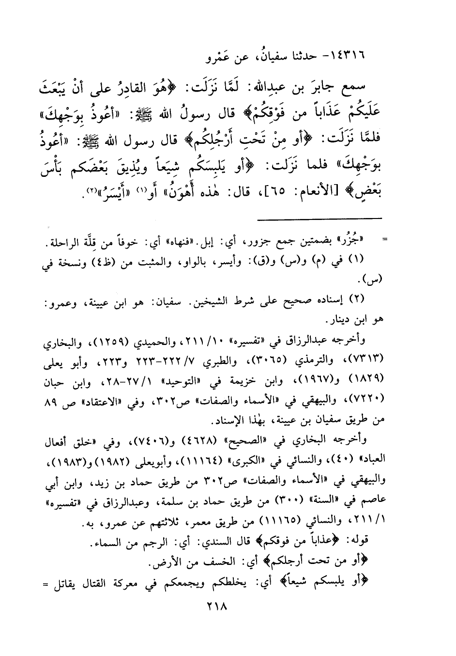 ١٤٣١٦ - حَدَّثَنَا سُفْيَانُ، عَنِ عَمْرٍو، سَمِعَ جَابِرَ بْنَ عَبْدِ اللهِ، لَمَّا نَزَلَتْ: {هُوَ الْقَادِرُ عَلَى أَنْ يَبْعَثَ عَلَيْكُمْ عَذَابًا مِنْ فَوْقِكُمْ} [الأنعام: ٦٥] ، قَالَ رَسُولُ اللهِ صَلَّى اللهُ عَلَيْهِ وَسَلَّمَ: " أَعُوذُ بِوَجْهِكَ "، فَلَمَّا نَزَلَتْ: {أَوْ مِنْ تَحْتِ أَرْجُلِكُمْ} [الأنعام: ٦٥] ، قَالَ رَسُولُ اللهِ صَلَّى اللهُ عَلَيْهِ وَسَلَّمَ: " أَعُوذُ بِوَجْهِكَ "، فَلَمَّا نَزَلَتْ {أَوْ يَلْبِسَكُمْ شِيَعًا وَيُذِيقَ بَعْضَكُمْ بَأْسَ بَعْضٍ} [الأنعام: ٦٥] ، قَالَ: " هَذِهِ أَهْوَنُ أَو (١) أَيْسَرُ " (٢)