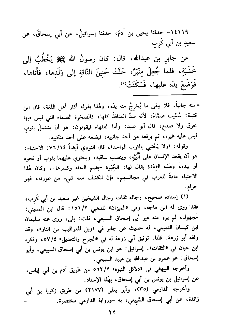 ١٤١١٩ - حَدَّثَنَا يَحْيَى بْنُ آدَمَ، حَدَّثَنَا إِسْرَائِيلُ، عَنْ أَبِي إِسْحَاقَ، عَنْ سَعِيدِ بْنِ أَبِي كَرِبٍ، عَنْ جَابِرِ بْنِ عَبْدِ اللهِ، قَالَ: " كَانَ رَسُولُ اللهِ صَلَّى اللهُ عَلَيْهِ وَسَلَّمَ يَخْطُبُ إِلَى خَشَبَةٍ، فَلَمَّا جُعِلَ مِنْبَرٌ، حَنَّتْ حَنِينَ النَّاقَةِ إِلَى وَلَدِهَا، فَأَتَاهَا فَوَضَعَ يَدَهُ عَلَيْهَا، فَسَكَنَتْ " (١)
