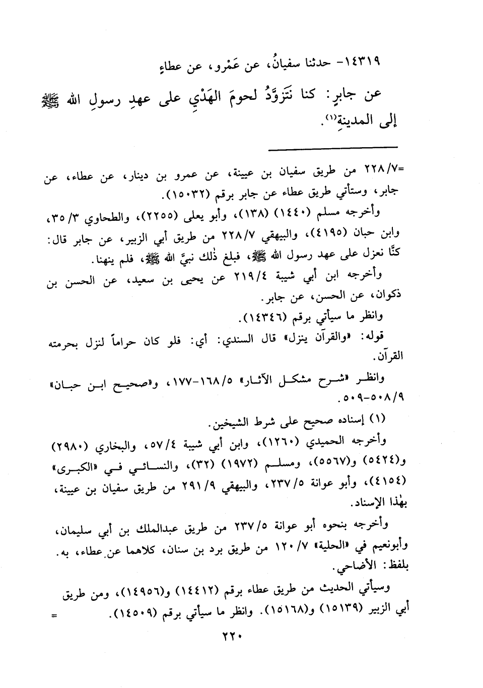= ٧/٢٢٨ من طريق سفيان بن عيينة، عن عمرو بن دينار، عن عطاء، عن جابر، وستأتي طريق عطاء عن جابر برقم (١٥٠٣٢) .