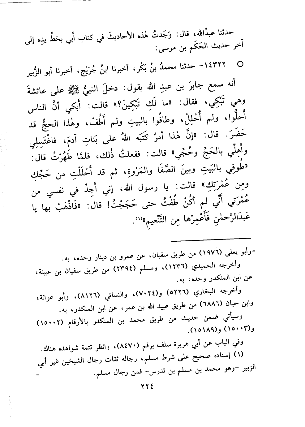 ° ١٤٣٢٢ - حَدَّثَنَا مُحَمَّدُ بْنُ بَكْرٍ، أَخْبَرَنَا ابْنُ جُرَيْجٍ، أَخْبَرَنَا أَبُو الزُّبَيْرِ، أَنَّهُ: سَمِعَ جَابِرَ بْنَ عَبْدِ اللهِ، يَقُولُ: دَخَلَ النَّبِيُّ صَلَّى اللهُ عَلَيْهِ وَسَلَّمَ عَلَى عَائِشَةَ وَهِيَ تَبْكِي، فَقَالَ: " مَا لَكِ تَبْكِينَ؟ "، قَالَتْ: أَبْكِي أَنَّ النَّاسَ أَحَلُّوا، وَلَمْ أَحْلِلْ، وَطَافُوا بِالْبَيْتِ، وَلَمْ أَطُفْ، وَهَذَا الْحَجُّ قَدْ حَضَرَ، قَالَ: " إِنَّ هَذَا أَمْرٌ كَتَبَهُ اللهُ عَلَى بَنَاتِ آدَمَ، فَاغْتَسِلِي وَأَهِلِّي بِالْحَجِّ، وَحُجِّي "، قَالَتْ: فَفَعَلْتُ ذَلِكَ، فَلَمَّا طَهُرْتُ، قَالَ: " طُوفِي بِالْبَيْتِ، وَبَيْنَ الصَّفَا وَالْمَرْوَةِ، ثُمَّ قَدْ أَحْلَلْتِ مِنْ حَجِّكِ، وَمِنْ عُمْرَتِكِ "، قَالَتْ: يَا رَسُولَ اللهِ، إِنِّي أَجِدُ فِي نَفْسِي مِنْ عُمْرَتِي أَنِّي لَمْ أَكُنْ طُفْتُ حَتَّى حَجَجْتُ، قَالَ: " فَاذْهَبْ بِهَا يَا عَبْدَ الرَّحْمَنِ، فَأَعْمِرْهَا مِنَ التَّنْعِيمِ " (١)