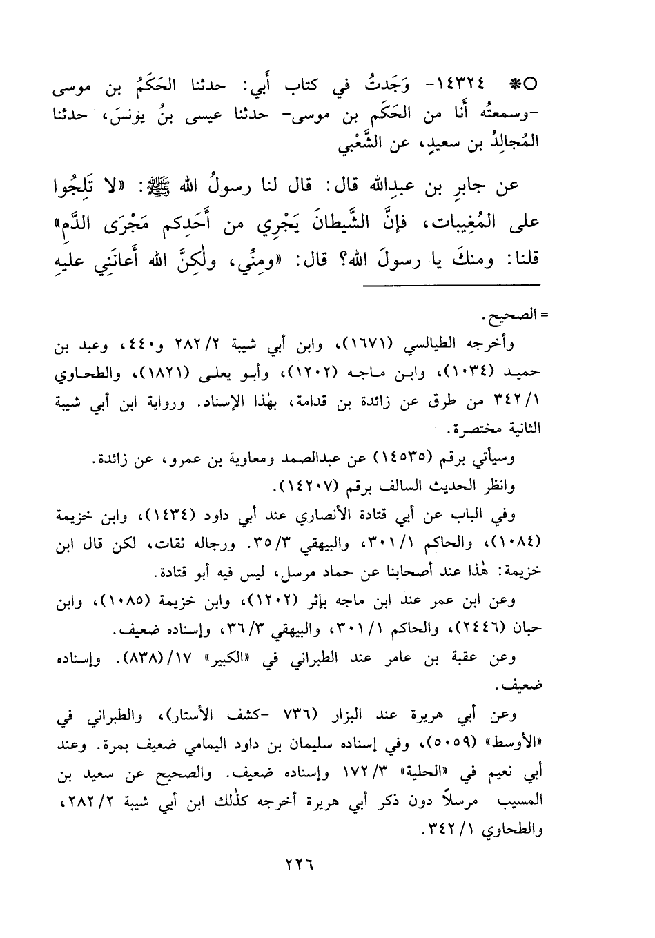 ° * ١٤٣٢٤ - وَجَدْتُ فِي كِتَابِ أَبِي: حَدَّثَنَا الْحَكَمُ بْنُ مُوسَى، وَسَمِعْتُهُ أَنَا مِنَ الْحَكَمِ بْنِ مُوسَى، حَدَّثَنَا عِيسَى بْنُ يُونُسَ، حَدَّثَنَا الْمُجَالِدُ بْنُ سَعِيدٍ، عَنِ الشَّعْبِيِّ، عَنْ جَابِرِ بْنِ عَبْدِ اللهِ، قَالَ: قَالَ لَنَا رَسُولُ اللهِ صَلَّى اللهُ عَلَيْهِ وَسَلَّمَ: " لَا تَلِجُوا عَلَى الْمُغِيبَاتِ، فَإِنَّ الشَّيْطَانَ يَجْرِي مِنْ أَحَدِكُمْ مَجْرَى الدَّمِ "، قُلْنَا: وَمِنْكَ يَا رَسُولَ اللهِ؟ قَالَ: " وَمِنِّي، وَلَكِنَّ اللهَ أَعَانَنِي عَلَيْهِ،