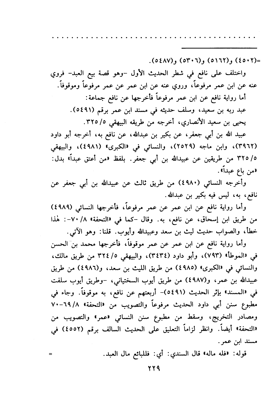 واختلف على نافع في شطر الحديث الأول -وهو قصة بيع العبد- فروي عنه عن ابن عمر مرفوعاً، وروي عنه عن ابن عمر عن عمر مرفوعاً وموقوفاً.
