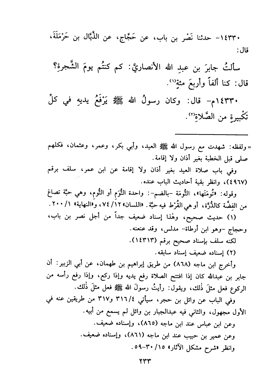 ١٤٣٣٠ - حَدَّثَنَا نَصْرُ بْنُ بَابٍ، عَنْ حَجَّاجٍ، عَنِ الذَّيَّالِ بْنِ حَرْمَلَةَ، قَالَ: سَأَلْتُ جَابِرَ بْنَ عَبْدِ اللهِ الْأَنْصَارِيَّ، كَمْ كُنْتُمْ يَوْمَ الشَّجَرَةِ؟ قَالَ: " كُنَّا أَلْفًا وَأَرْبَعَ مِائَةٍ " (١)