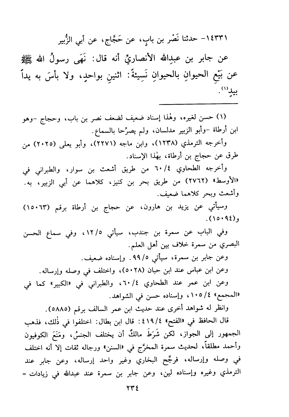 ١٤٣٣١ - حَدَّثَنَا نَصْرُ بْنُ بَابٍ، عَنْ حَجَّاجٍ، عَنْ أَبِي الزُّبَيْرِ، عَنْ جَابِرِ بْنِ عَبْدِ اللهِ الْأَنْصَارِيِّ، أَنَّهُ قَالَ: " نَهَى رَسُولُ اللهِ صَلَّى اللهُ عَلَيْهِ وَسَلَّمَ عَنْ بَيْعِ الْحَيَوَانِ بِالْحَيَوَانِ نَسِيئَةً: اثْنَيْنِ بِوَاحِدٍ، وَلَا بَأْسَ بِهِ يَدًا بِيَدٍ "، (١)