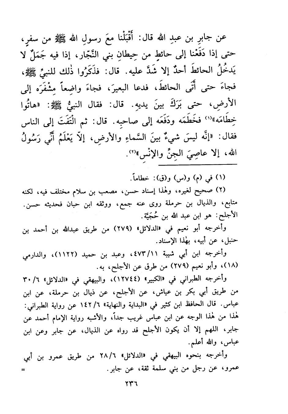 عَنْ جَابِرِ بْنِ عَبْدِ اللهِ، قَالَ: أَقْبَلْنَا مَعَ رَسُولِ اللهِ صَلَّى اللهُ عَلَيْهِ وَسَلَّمَ مِنْ سَفَرٍ، حَتَّى إِذَا دَفَعْنَا إِلَى حَائِطٍ مِنْ حِيطَانِ بَنِي النَّجَّارِ، إِذَا فِيهِ جَمَلٌ لَا يَدْخُلُ الْحَائِطَ أَحَدٌ إِلَّا شَدَّ عَلَيْهِ، قَالَ: فَذَكَرُوا ذَلِكَ لِلنَّبِيِّ صَلَّى اللهُ عَلَيْهِ وَسَلَّمَ، فَجَاءَ حَتَّى أَتَى الْحَائِطَ، فَدَعَا الْبَعِيرَ، فَجَاءَ وَاضِعًا مِشْفَرَهُ إِلَى الْأَرْضِ، حَتَّى بَرَكَ بَيْنَ يَدَيْهِ، قَالَ: فَقَالَ النَّبِيُّ صَلَّى اللهُ عَلَيْهِ وَسَلَّمَ: " هَاتُوا خِطَامَهُ "، (١) فَخَطَمَهُ، وَدَفَعَهُ إِلَى صَاحِبِهِ، قَالَ: ثُمَّ الْتَفَتَ إِلَى النَّاسِ، قَالَ: " إِنَّهُ لَيْسَ شَيْءٌ بَيْنَ السَّمَاءِ وَالْأَرْضِ، إِلَّا يَعْلَمُ أَنِّي رَسُولُ اللهِ، إِلَّا عَاصِيَ الْجِنِّ وَالْإِنْسِ " (٢)