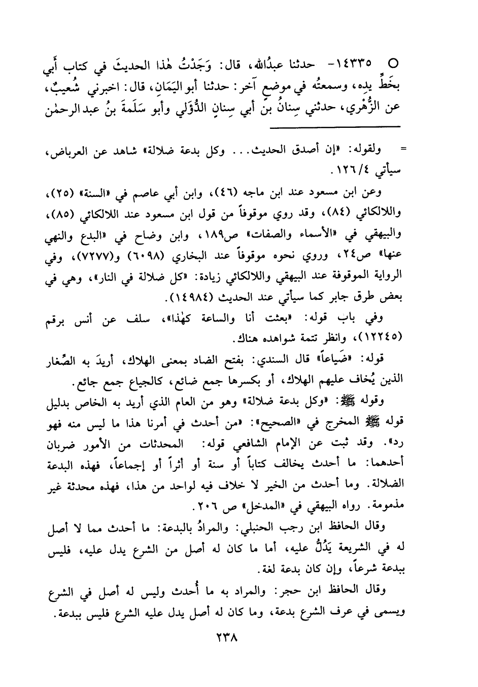 وقوله صَلَّى اللهُ عَلَيْهِ وَسَلَّمَ: "وكل بدعة ضلالة" وهو من العام الذي أريد به الخاص بدليل قوله صَلَّى اللهُ عَلَيْهِ وَسَلَّمَ المخرج في "الصحيح": "من أحدث في أمرنا هذا ما ليس منه فهو رد". وقد ثبت عن الإمام الشافعي قوله: المحدثات من الأمور ضربان أحدهما: ما أحدث يخالف كتاباً أو سنة أو أثراً أو إجماعاً، فهذه البدعة الضلالة. وما أحدث من الخير لا خلاف فيه لواحد من هذا، فهذه محدثة غير
