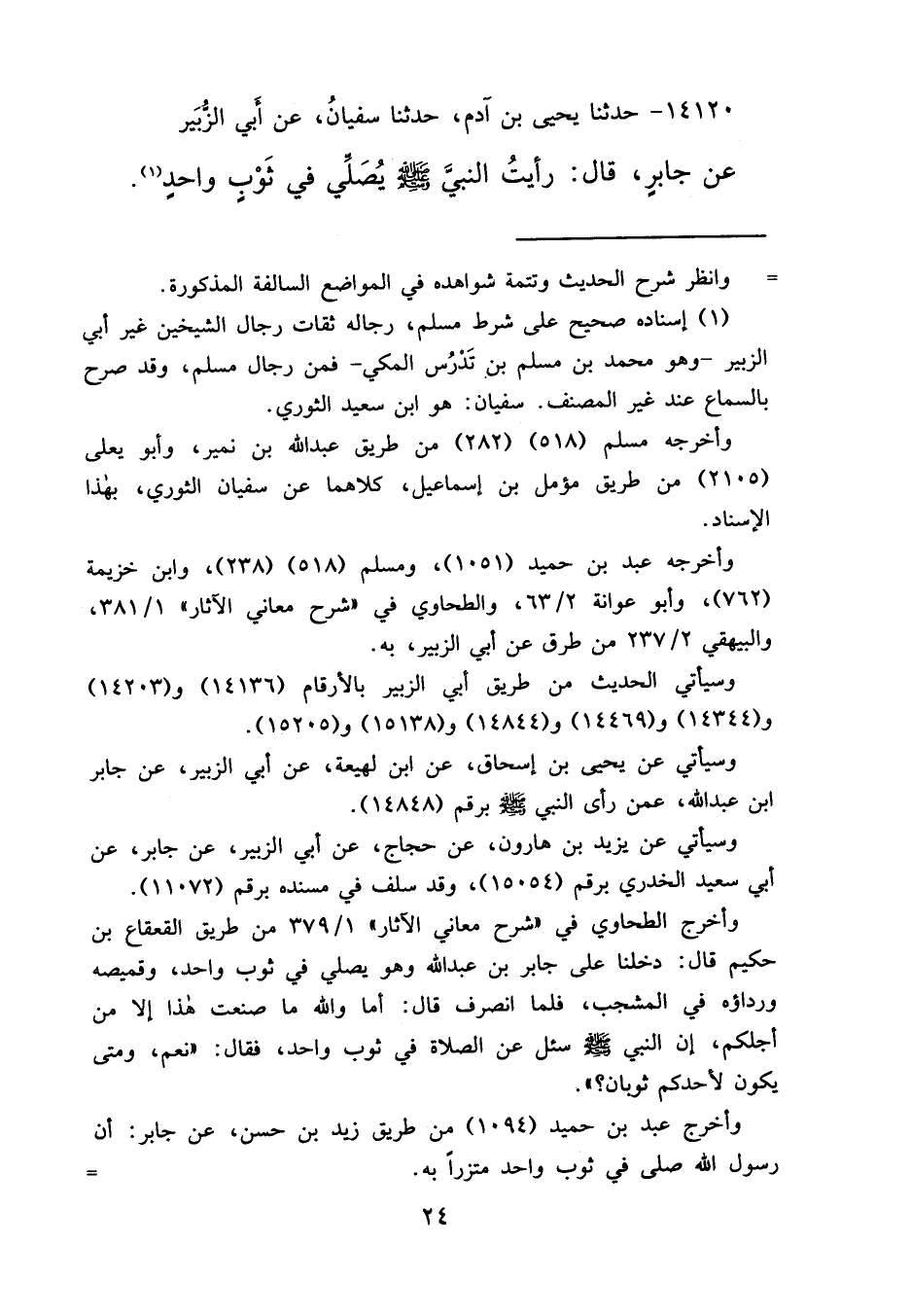 ١٤١٢٠ - حَدَّثَنَا يَحْيَى بْنُ آدَمَ، حَدَّثَنَا سُفْيَانُ، عَنْ أَبِي الزُّبَيْرِ، عَنْ جَابِرٍ، قَالَ: " رَأَيْتُ النَّبِيَّ صَلَّى اللهُ عَلَيْهِ وَسَلَّمَ يُصَلِّي فِي ثَوْبٍ وَاحِدٍ " (١)