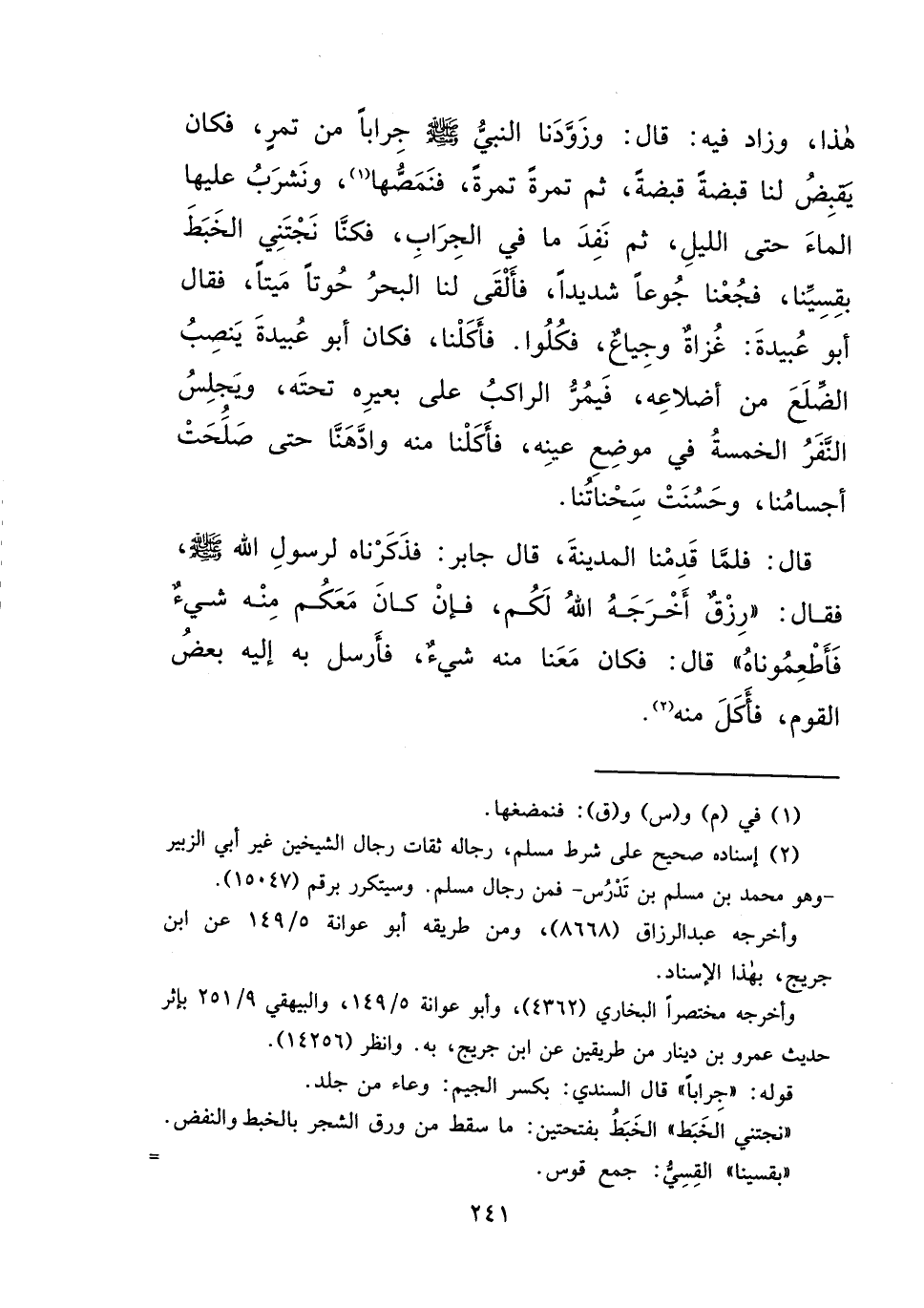 هَذَا وَزَادَ فِيهِ، قَالَ: وَزَوَّدَنَا النَّبِيُّ صَلَّى اللهُ عَلَيْهِ وَسَلَّمَ جِرَابًا مِنْ تَمْرٍ، فَكَانَ يَقْبِضُ لَنَا قَبْضَةً قَبْضَةً، ثُمَّ تَمْرَةً تَمْرَةً، فَنَمُصُّهَا، (١) وَنَشْرَبُ عَلَيْهَا الْمَاءَ حَتَّى اللَّيْلِ، ثُمَّ نَفِدَ مَا فِي الْجِرَابِ، فَكُنَّا نَجْتَنِي الْخَبَطَ بِقِسِيِّنَا، فَجُعْنَا جُوعًا شَدِيدًا، فَأَلْقَى لَنَا الْبَحْرُ حُوتًا مَيِّتًا، فَقَالَ أَبُو عُبَيْدَةَ: غُزَاةٌ وَجِيَاعٌ فَكُلُوا، فَأَكَلْنَا، فَكَانَ أَبُو عُبَيْدَةَ يَنْصِبُ الضِّلَعَ مِنْ أَضْلَاعِهِ، فَيَمُرُّ الرَّاكِبُ عَلَى بَعِيرِهِ تَحْتَهُ، وَيَجْلِسُ النَّفَرُ الْخَمْسَةُ فِي مَوْضِعِ عَيْنِهِ، فَأَكَلْنَا مِنْهُ، وَادَّهَنَّا حَتَّى صَلَحَتْ أَجْسَامُنَا، وَحَسُنَتْ سَحْنَاتُنَا، قَالَ: فَلَمَّا قَدِمْنَا الْمَدِينَةَ، قَالَ جَابِرٌ: فَذَكَرْنَاهُ لِرَسُولِ اللهِ صَلَّى اللهُ عَلَيْهِ وَسَلَّمَ فَقَالَ: " رِزْقٌ أَخْرَجَهُ اللهُ لَكُمْ، فَإِنْ كَانَ مَعَكُمْ مِنْهُ شَيْءٌ فَأَطْعِمُونَاهُ "، قَالَ: فَكَانَ مَعَنَا مِنْهُ شَيْءٌ، فَأَرْسَلَ بِهِ إِلَيْهِ بَعْضُ الْقَوْمِ، فَأَكَلَ مِنْهُ (٢)