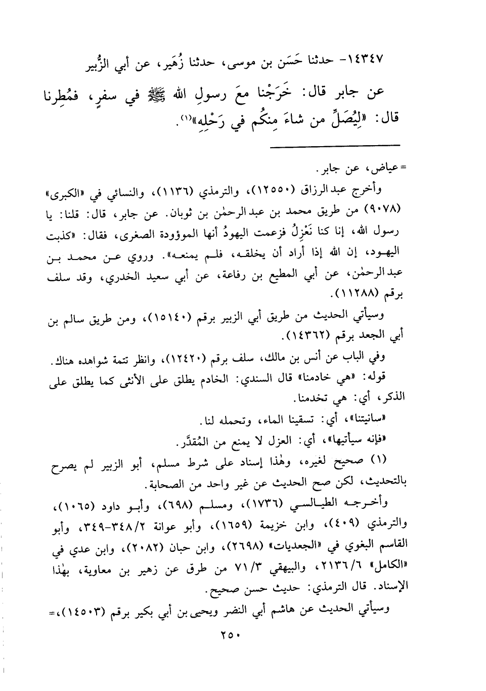 ١٤٣٤٧ - حَدَّثَنَا حَسَنُ بْنُ مُوسَى، حَدَّثَنَا زُهَيْرٌ، عَنْ أَبِي الزُّبَيْرِ، عَنْ جَابِرٍ، قَالَ: خَرَجْنَا مَعَ رَسُولِ اللهِ صَلَّى اللهُ عَلَيْهِ وَسَلَّمَ فِي سَفَرٍ، فَمُطِرْنَا، قَالَ: " لِيُصَلِّ مَنْ شَاءَ مِنْكُمْ فِي رَحْلِهِ " (١)