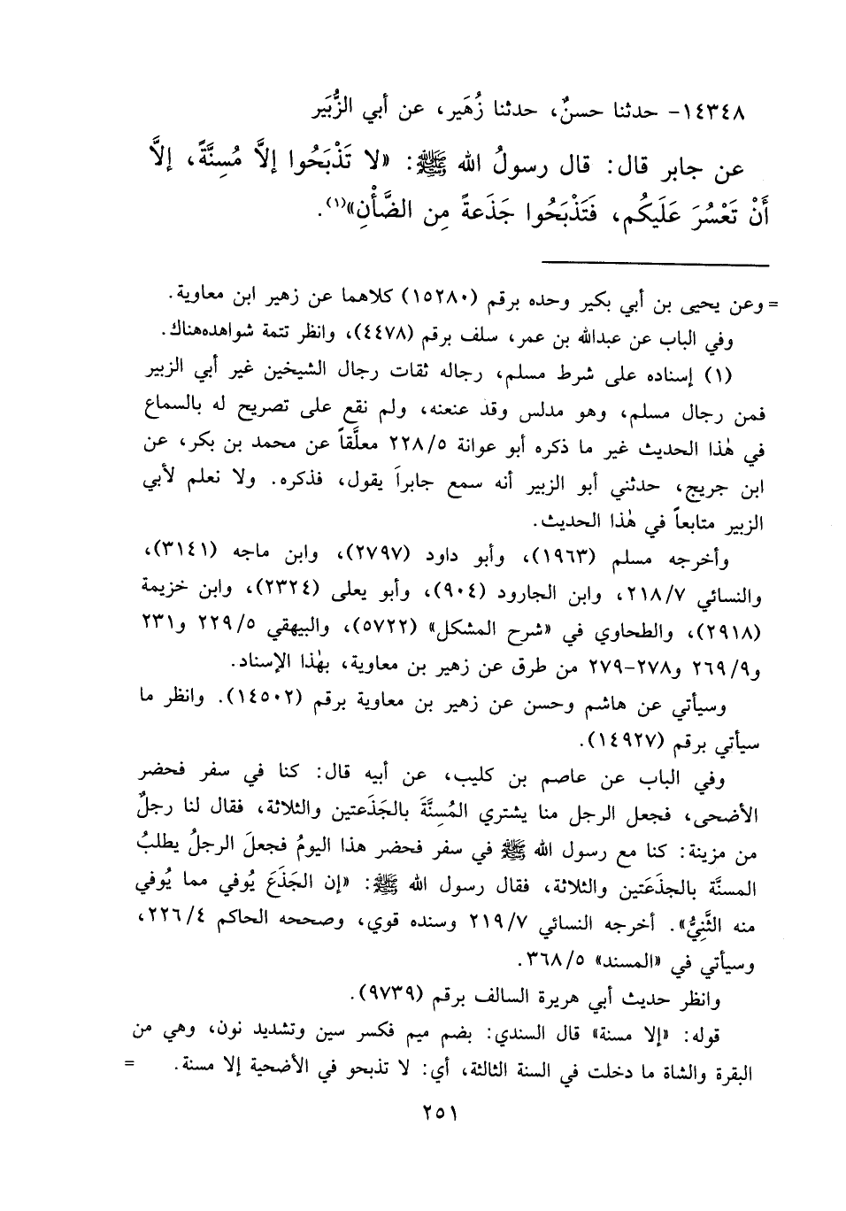 ١٤٣٤٨ - حَدَّثَنَا حَسَنٌ، حَدَّثَنَا زُهَيْرٌ، عَنْ أَبِي الزُّبَيْرِ، عَنْ جَابِرٍ، قَالَ: قَالَ رَسُولُ اللهِ صَلَّى اللهُ عَلَيْهِ وَسَلَّمَ: " لَا تَذْبَحُوا إِلَّا مُسِنَّةً، إِلَّا أَنْ تَعْسُرَ عَلَيْكُمْ، فَتَذْبَحُوا جَذَعَةً مِنَ الضَّأْنِ " (١)