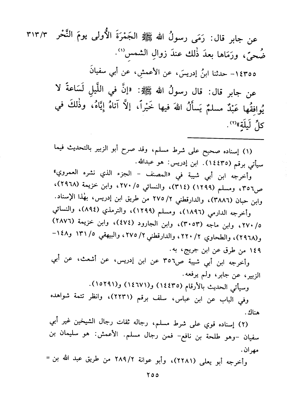 ١٤٣٥٥ - حَدَّثَنَا ابْنُ إِدْرِيسَ، عَنِ الْأَعْمَشِ، عَنْ أَبِي سُفْيَانَ، عَنْ جَابِرٍ، قَالَ: قَالَ رَسُولُ اللهِ صَلَّى اللهُ عَلَيْهِ وَسَلَّمَ: " إِنَّ فِي اللَّيْلِ لَسَاعَةً، لَا يُوَافِقُهَا عَبْدٌ مُسْلِمٌ، يَسْأَلُ اللهَ فِيهَا خَيْرًا، إِلَّا آتَاهُ إِيَّاهُ، وَذَلِكَ فِي كُلِّ لَيْلَةٍ " (٢)
