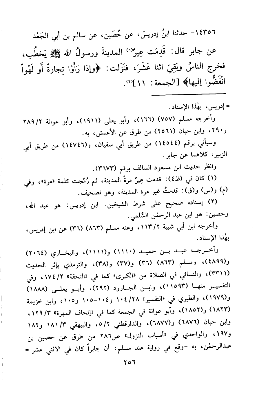 ١٤٣٥٦ - حَدَّثَنَا ابْنُ إِدْرِيسَ، عَنْ حُصَيْنٍ، عَنْ سَالِمِ بْنِ أَبِي الْجَعْدِ، عَنْ جَابِرٍ، قَالَ: " قَدِمَتْ عِيرٌ (١) الْمَدِينَةَ وَرَسُولُ اللهِ صَلَّى اللهُ عَلَيْهِ وَسَلَّمَ يَخْطُبُ، فَخَرَجَ النَّاسُ، وَبَقِيَ اثْنَا عَشَرَ، فَنَزَلَتْ: {وَإِذَا رَأَوْا تِجَارَةً أَوْ لَهْوًا انْفَضُّوا إِلَيْهَا} [الجمعة: ١١] " (٢)