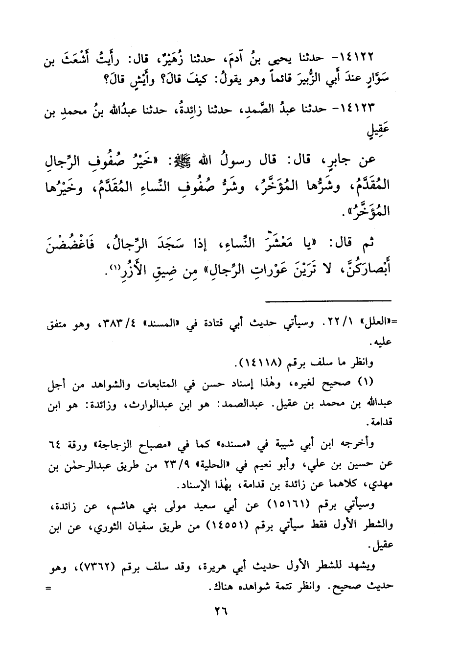 ١٤١٢٣ - حَدَّثَنَا عَبْدُ الصَّمَدِ، حَدَّثَنَا زَائِدَةُ، حَدَّثَنَا عَبْدُ اللهِ بْنُ مُحَمَّدِ بْنِ عَقِيلٍ، عَنْ جَابِرٍ، قَالَ: قَالَ رَسُولُ اللهِ صَلَّى اللهُ عَلَيْهِ وَسَلَّمَ: " خَيْرُ صُفُوفِ الرِّجَالِ الْمُقَدَّمُ، وَشَرُّهَا الْمُؤَخَّرُ، وَشَرُّ صُفُوفِ النِّسَاءِ الْمُقَدَّمُ، وَخَيْرُهَا الْمُؤَخَّرُ "، ثُمَّ قَالَ: " يَا مَعْشَرَ النِّسَاءِ، إِذَا سَجَدَ الرِّجَالُ فَاغْضُضْنَ أَبْصَارَكُنَّ، لَا تَرَيْنَ عَوْرَاتِ الرِّجَالِ مِنْ ضِيقِ الْأُزُرِ " (١)