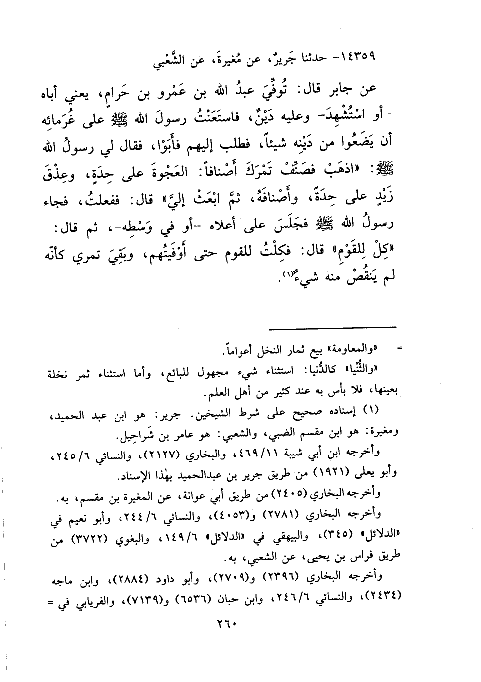 ١٤٣٥٩ - حَدَّثَنَا جَرِيرٌ، عَنْ مُغِيرَةَ، عَنِ الشَّعْبِيِّ، عَنْ جَابِرٍ، قَالَ: تُوُفِّيَ عَبْدُ اللهِ بْنُ عَمْرِو بْنِ حَرَامٍ، يَعْنِي أَبَاهُ - أَوْ اسْتُشْهِدَ -، وَعَلَيْهِ دَيْنٌ، فَاسْتَعَنْتُ رَسُولَ اللهِ صَلَّى اللهُ عَلَيْهِ وَسَلَّمَ عَلَى غُرَمَائِهِ أَنْ يَضَعُوا مِنْ دَيْنِهِ شَيْئًا، فَطَلَبَ إِلَيْهِمْ، فَأَبَوْا، فَقَالَ لِي رَسُولُ اللهِ صَلَّى اللهُ عَلَيْهِ وَسَلَّمَ: " اذْهَبْ فَصَنِّفْ تَمْرَكَ أَصْنَافًا، الْعَجْوَةَ عَلَى حِدَةٍ، وَعِذْقَ زَيْدٍ عَلَى حِدَةٍ، وَأَصْنَافَهُ، ثُمَّ ابْعَثْ إِلَيَّ "، قَالَ: فَفَعَلْتُ، فَجَاءَ رَسُولُ اللهِ صَلَّى اللهُ عَلَيْهِ وَسَلَّمَ، فَجَلَسَ عَلَى أَعْلَاهُ، أَوْ فِي وَسَطِهِ، ثُمَّ قَالَ: " كِلْ لِلْقَوْمِ "، قَالَ: فَكِلْتُ لِلْقَوْمِ حَتَّى أَوْفَيْتُهُمْ، وَبَقِيَ تَمْرِي كَأَنَّهُ لَمْ يَنْقُصْ مِنْهُ شَيْءٌ (١)